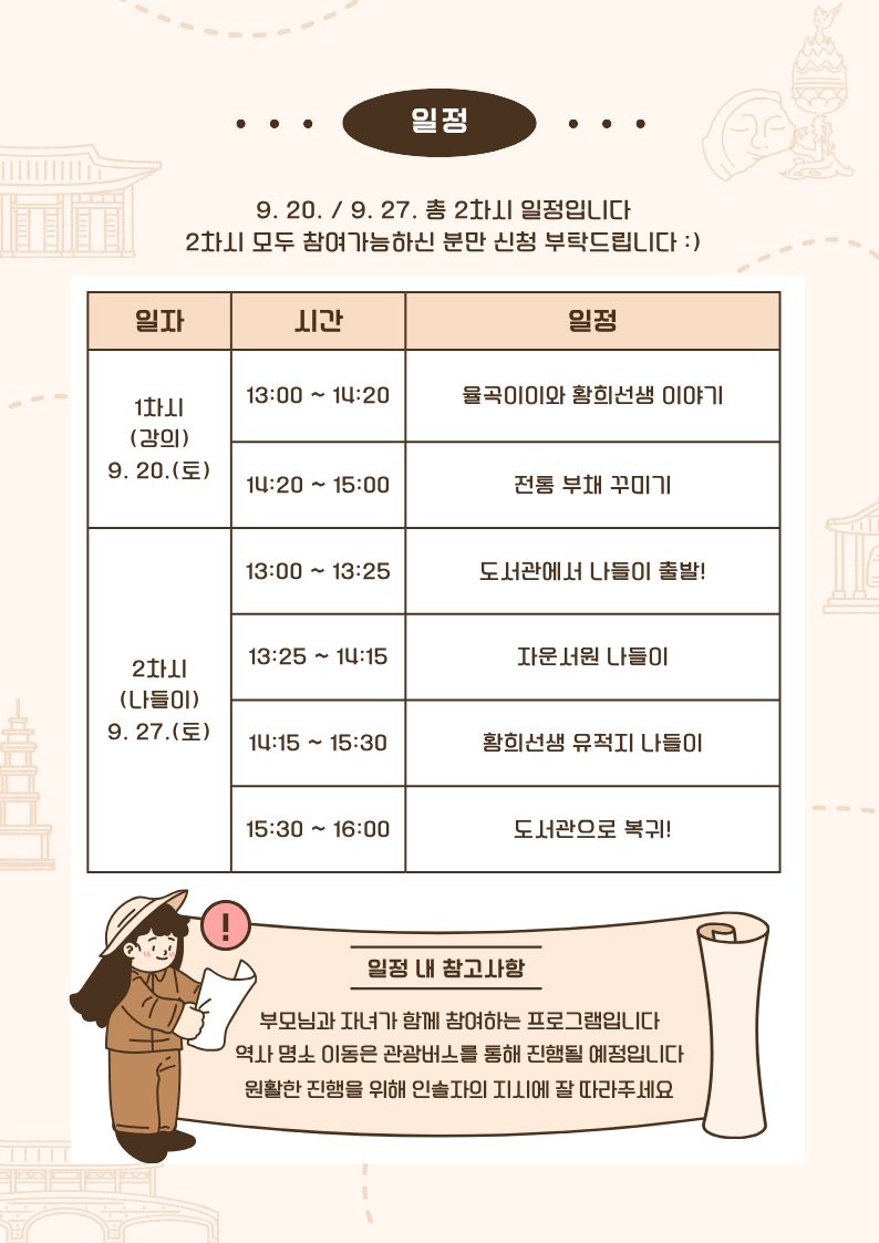 ![]() ![]() ![]() 법원도서관 독서의 달 문화프로그램 함께 가요! 파주 역사 나들이 부모님과 자녀가 함께 파주를 빛낸 위인들을 탐구하는 시간을 준비했어요. 율곡이이, 황희선생님에 대한 신비로운 이야기를 가을 바람의 정취와 함께 즐기며 아름다운 파주의 유적지를 산책하는 시간을 가져보세요! 날짜: 2025. 9. 20.(토) / 9. 27.(토) 대상: 초등학생 및 학부모 8팀 장소: 법원도서관 등(포스터 내 세부일정 참고) 진행: 이윤희 스토리텔러 접수: 9. 3.(수) 낮 12시 ~ 선착순(도서관 홈페이지, 전화, 방문) 문의: 031-940-4194 *부모님과 자녀가 함께 참여하는 프로그램입니다. ** 9월 20일과 9월 27일 모두 참석이 가능하신 경우만 신청을 부탁드립니다. *** 신청 후 참여가 어려우신 신청자분들은 다른 신청자분들을 위해 반드시 프로그램 전날까지 연락을 부탁드립니다. |