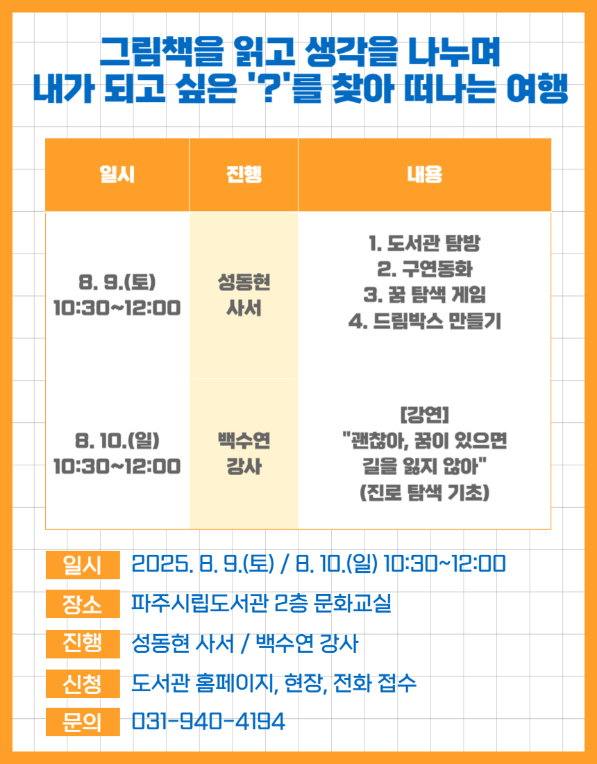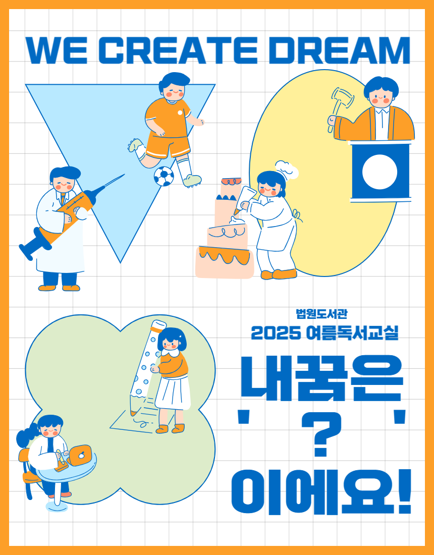 ![]() ![]() 법원도서관 여름독서교실 내 꿈은 ' ' 이에요! 내 인생의 주인공인 나는 앞으로 어떤 꿈을 가지게 될까요? 지금 내가 어떤 사람이고 무엇을 하고 싶은지 알게되면, 분명히 더 다채롭고 선명한 꿈이 펼쳐질 거예요. 그림책과 게임, 특별한 강의를 통해 꿈에 대한 생각을 함께 나누며 나는 과연 어떤 사람이 되고 싶은지, 마음속 숨겨진 꿈을 찾아가보아요! 일시: 2025. 8. 9.(토)~8. 10.(일) 10:30~12:00 대상: 초등학생 1~3학년 및 학부모 10팀(총 20명) 장소: 법원도서관 2층 문화교실 진행: 성동현 사서, 백수연 강사(독산청소년문화의집 관장) 접수: 7. 25. (금) 오전 9시 ~ 선착순(도서관 홈페이지, 전화, 방문) 문의: 031-940-4194 *부모님 1명과 자녀 1명이 팀을 이뤄 함께 참여하는 프로그램입니다. ** 8월 9일과 10일 모두 참석이 가능하신 경우만 신청을 부탁드립니다. *** 신청 후 참여가 어려우신 신청자분들은 다른 신청자분들을 위해 반드시 행사 전날까지 연락을 부탁드립니다. |