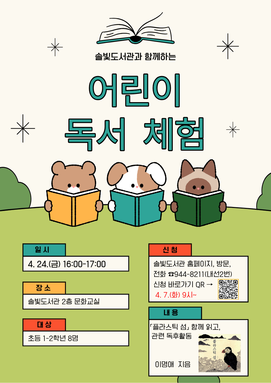 솔빛도서관과 함께하는 🌷🌷 4월 어린이 독서체험 📖📖 ✨ 일 시: 2026. 4. 24.(금) 16:00~17:00 ✨ 장 소: 솔빛도서관 2층 문화교실 ✨ 대 상: 초등학교 1~2학년 / 8명 ✨ 신 청: 4. 7.(화) 09:00 ~ 솔빛도서관 홈페이지, 방문, 전화 접수 ☎️944-8211(내선2번 어린이자료실) ✨ 내 용: 그림책 <플라스틱 섬> 함께 읽고, 관련 독후활동 🎈주제도서: 플라스틱 섬 /이명애, 사계절, 2014 ![]() |