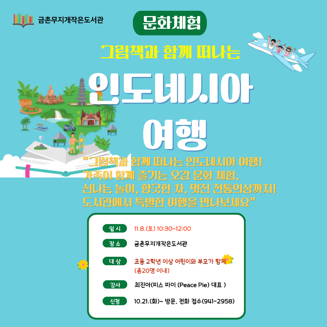 [문화체험] 그림책과 함께 떠나는 인도네시아 여행 "그림책과 함께 떠나는 인도네시아 여행! 가족이 함께 즐기는 오감 문화 체험. 신나는 놀이, 향긋한 차, 멋진 전통의상까지! 도서관에서 특별한 여행을 만나보세요" 기간: 11.8.(토) 10:30~12:00 대상: 초등 2학년 이상 어린이와 부모가 함께(총20명 이내) 장소: 금촌무지개작은도서관 강사: 최진아(피스 파이 (Peace Pie) 대표 ) 신청: 10.21.(화)~ 방문, 전화 접수(941-2958)