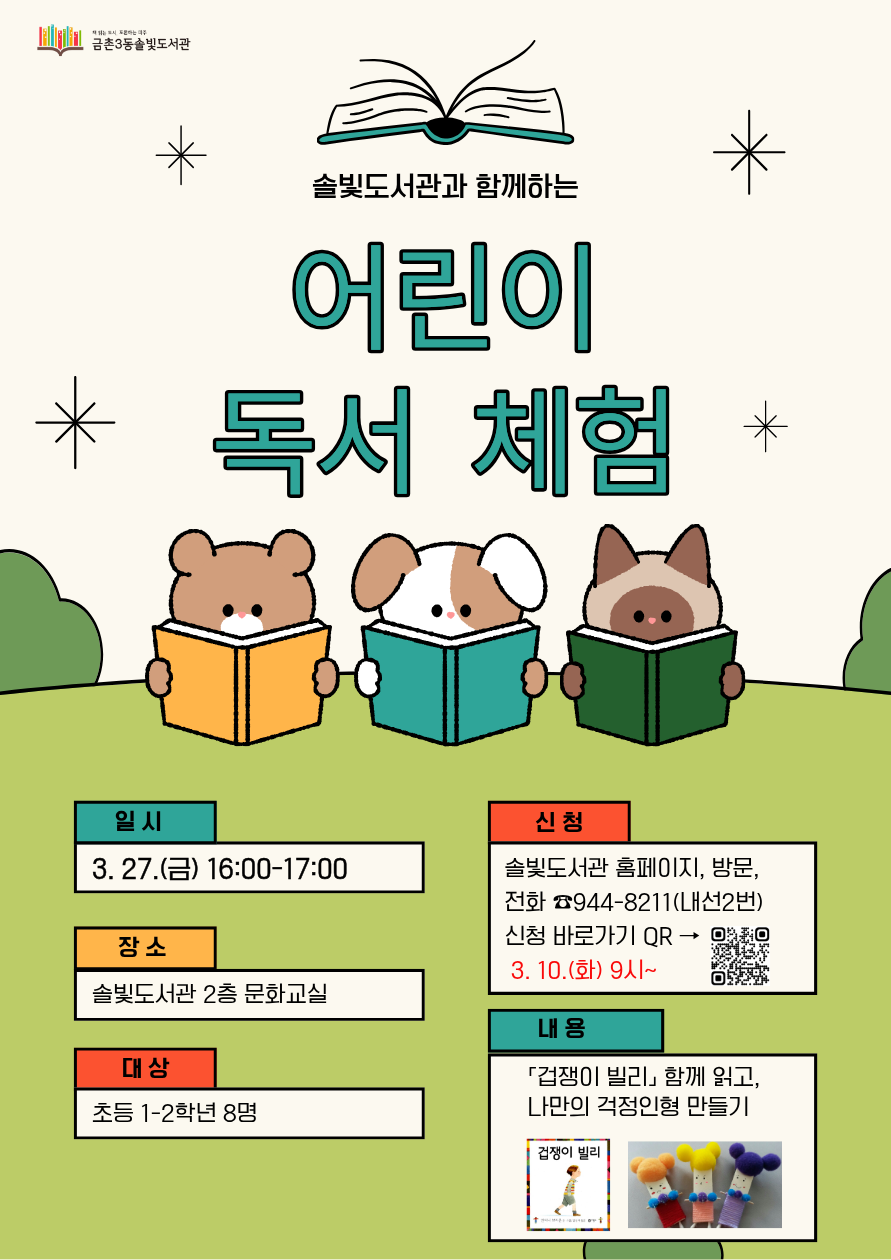 솔빛도서관과 함께하는 ✨ 일 시: 2026. 3. 27.(금) 16:00~17:00 ✨ 장 소: 솔빛도서관 2층 문화교실 ✨ 대 상: 초등학교 1~2학년 / 8명 ✨ 신 청: 3. 10.(화) 09:00 ~ 솔빛도서관 홈페이지, 방문, 전화 접수 ☎️944-8211(내선2번 어린이자료실) ✨ 내 용: 그림책 <겁쟁이 빌리> 함께 읽고, 나만의 걱정인형 만들기