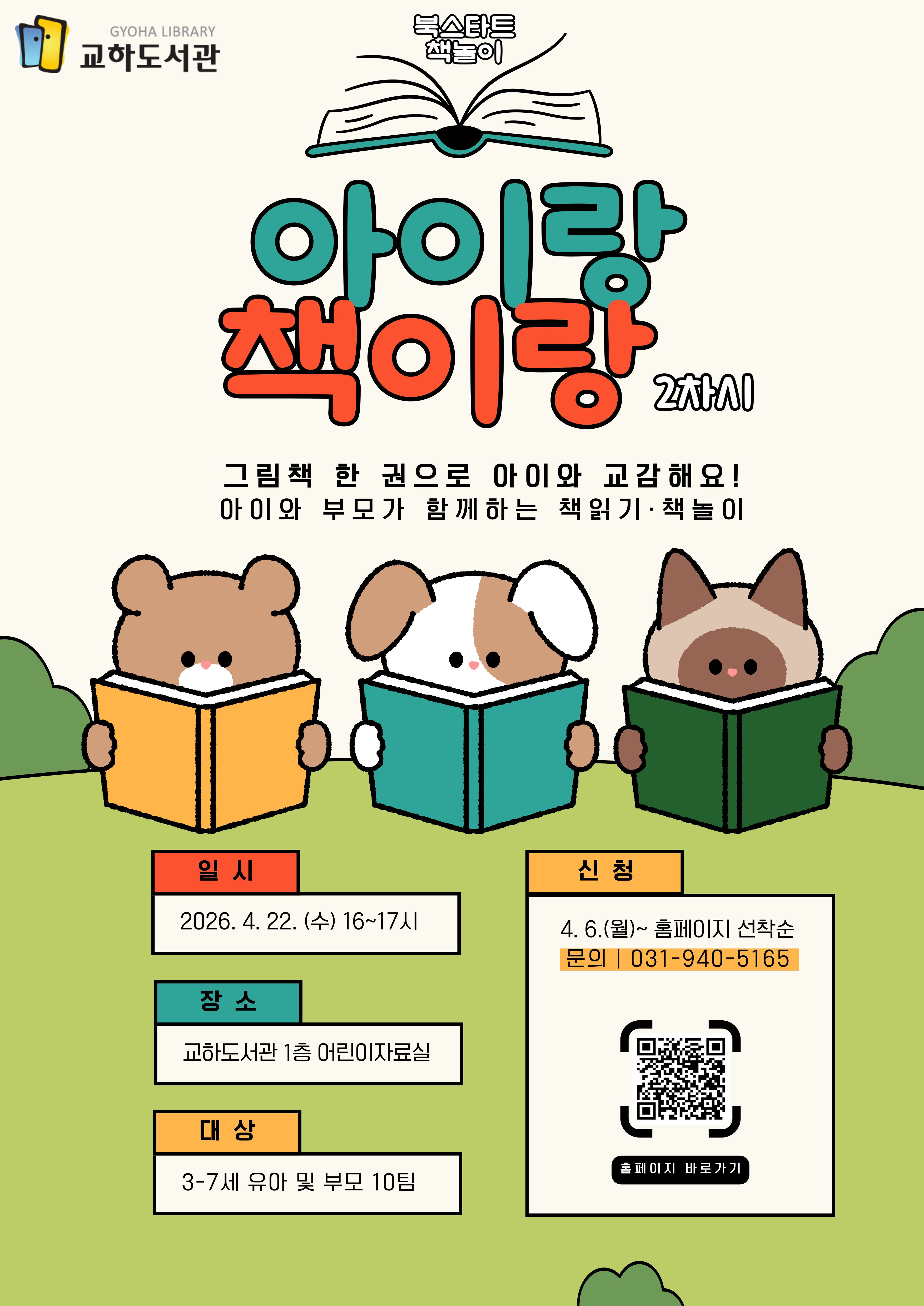 [북스타트 책놀이] 아이랑 책이랑 (총 4차시 중 2차시) ※ 각 차시는 서로 연계되지 않으며, 이전 차시 참여 여부와 관계없이 자유롭게 참여하실 수 있습니다. ■ 일시: 4.22.(수) 16시~17시 ■ 장소: 교하도서관 1층 어린이자료실 ■ 대상: 3-7세 유아 및 부모 10팀 ■ 신청: 4. 6.(월) 오전 9시~ 홈페이지 선착순 ![]() 생애초기 독서습관 형성 및 양육가정 도서관 이용 활성화를 도모하는 북스타트 사업과 연계하여 월 1회(3~6월, 총 4회) 진행되는 교하도서관 북스타트 책놀이 프로그램 '아이랑 책이랑'은 아이와 부모가 함께 그림책을 읽고 감상을 나눈 후, 후속 체험활동을 진행하며 교감하는 프로그램입니다. 4월에는 「엄마」(김완하, 여유당, 2025.)을 읽고 사랑을 표현하는 압화액자 만들기 활동을 진행할 예정입니다. (진행내용 일부 변동가능) |