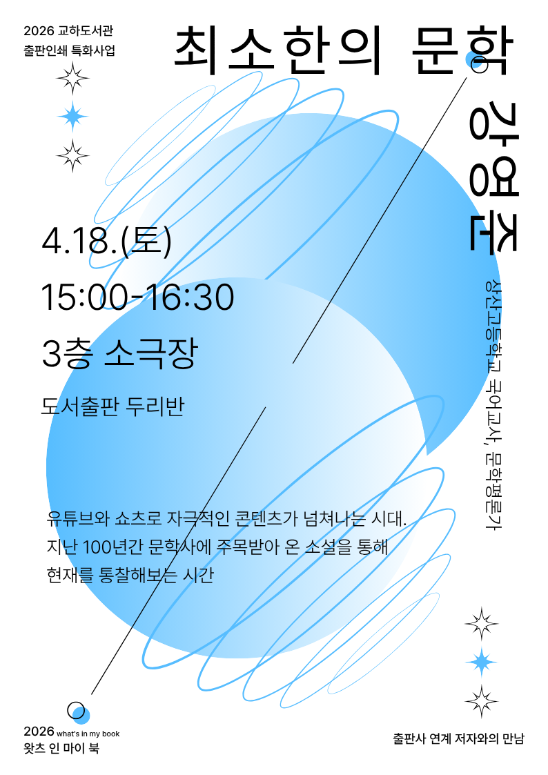 ![]() 2026년 교하도서관 출판인쇄 특화사업 | 출판사 연계 저자와의 만남 왓츠 인 마이 북 what's in my book '저자가 소개하는 내 책의 모든 것'을 주제로 2026년 새로운 책을 출간한 출판사와 함께 운영하는 저자와의 만남 사업입니다. <최소한의 문학> 강영준 작가와의 만남 • 일 시 2026. 4. 18.(토) 15:00~16:30 • 장 소 교하도서관 3층 소극장 • 대 상 성인 누구나, 50명 • 신 청 4. 1. (수) ~ 전화(940-5153), 방문, 홈페이지 • 초 청 강영준(상산고등학교 국어교사, 문학평론가) • 내 용 유튜브와 쇼츠로 자극적인 콘텐츠가 넘쳐나는 시대. 지난 100년간 문학사에 주목받아 온 소설을 통해 현재를 통찰해보는 시간 ![]() • 제목 최소한의 문학 문학은 언제나 제도보다 앞서 있었고, 공식적인 역사보다 구체적인 삶의 기록을 남겨왔습니다. 이 책은 교과서가 미처 담아내지 못한 개인의 감정과 공동체가 침묵해온 약자의 고난, 사회 시스템이 외면해온 순간들을 마주하게 하며, 오늘의 우리가 나아갈 방향을 사유하게 합니다. 유튜브 쇼츠와 SNS 등 짧고 강한 자극을 제공하는 콘텐츠가 넘쳐나는 시대에 100년전의 문학이 어떤 역할을 할 수 있을까요? 우리는 왜 과거의 문학을 읽어야 할까요? 이 책은 지난 100년 동안 우리 문학사에 주목받은 소설들을 통해 한국사회의 모습을 들여다봅니다. 교과서에 등장하지만 학교에서는 가르쳐주지 않는 “인간”을 보는 관점을 보여주는 책입니다. • 저자 강영준 상산고등학교 국어 교사로 십대들과 함께 독서와 문학을 공부하고 있다. 2010년 《시와반시》를 통해 문학평론으로 등단했으며, 《허균 씨, 홍길동전은 왜 쓰셨나요?》로 제7회 창비 청소년도서상을 받았다. 대표적인 책으로는 문학과 역사를 접목한 《시로 읽자, 우리 역사》와 문학과 심리학을 아우르는 《친애하는 내 마음에게》가 있으며, 이 외에도 《101가지 문학질문사전》, 《흰 바람벽이 있어-백석 이야기》, 《칠월의 청포도-이육사 이야기》 등 다수의 책을 펴냈다. • 출판사 두리반 시대의 이슈를 담은 인문/사회 도서를 출간합니다 |