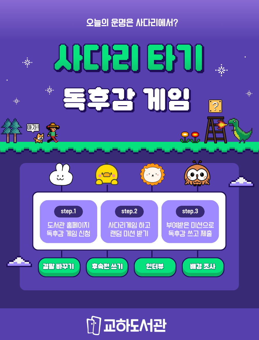 2. 10월 13일(월) 카카오톡 오픈채팅방에서 사다리게임으로 랜덤 미션 부여(결말 바꾸기, 편지쓰기 등)*10월 13일(월) 오픈채팅방 링크발송 예정 3. 부여받은 미션으로 10월 19일(일)까지 독후감을 작성해서 네이버 밴드 <사다리게임> 사진첩에 올리기 * 서명, 저자, 출판사, 부여받은 미션을 독후감(띄어쓰기 포함 500자 이상)과 함께 올리기 * 바로가기 클릭>>>독후감게임 온라인 작품집 | 밴드 4. 본인이 올린 독후감에 비밀댓글로 이름, 연락처, 카카오톡 닉네임 적기 * 손글씨로 작성한 독후감을 찍어서 사진으로 올리기, 밴드에 직접 작성 모두 가능 5. 참여 인센티브 : 지역서점이용권(1만원) 증정 ![]() |