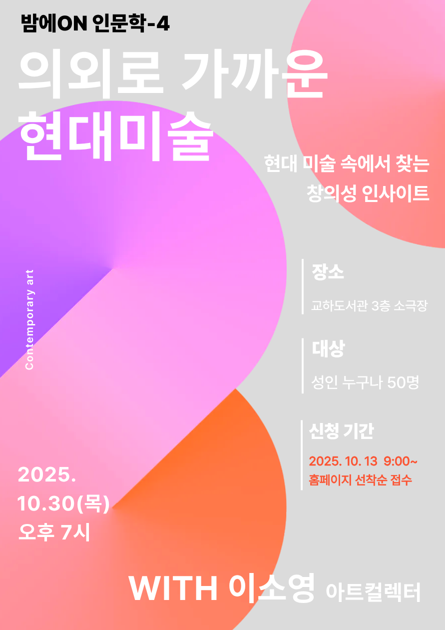 밤에ON 인문학④-의외로 가까운 현대미술 -현대 미술 속에서 찾는 창의성 인사이트- 전시는 자주 보러 가지만, 현대미술은 여전히 어렵게 느껴지시나요? 다양한 경력을 가지고 있는 이 분야 전문가와 함께 해외의 다양한 비엔날레,해외 아트페어 속 현대미술 작품들을 통해 인사이트를 얻고, 동시대 미술 속 창의성에 대해 이해해보는 특별한 시간을 가져보세요!^^ ------------------------------------------------------------------- 이소영 작가(아트컬렉터,소통하는 그림연구소 대표) <라디오 및 방송> 2016년10월대교TV<모네의빛콘서트>진행 -2016년11월SBSTNBC<아는만큼보인다>미술칼럼니스트 -2015KBS<사랑의책방>그림은위로다 -2016EBS<책으로행복한시간12시최현정입니다>-작가의서재:명화보기좋은날 -2017 EBS<책으로행복한시간12시박소현입니다>-그림은위로다 -2018 EBS<교양있는목요일>-나를행복하게하는그림 -2021 tvN'유퀴즈온더블록'아트컬렉터편 -2022EBS비즈니스리뷰아트경영특강 <유튜브> 아트메신저 이소영 https://www.youtube.com/channel/UC682FgVuSe0ZaWYW-_Atw0w <유퀴즈 방송출연(2021)> https://www.youtube.com/watch?v=kv7RVLfSGA8 https://www.youtube.com/watch?v=Hx5VUAm93qQ <기업 미술활동 프로젝트> -2016년 현대자동차 <화려한손길> 프로젝트 –서울 정원 박람회-바닥 그림 그리기 기획 및 미술파트 진행 -2017년 현대자동차 <화려한손길> 프로젝트 –여의도 공원 멸종 위기 동물 대형 설치 작업 기획 및 미술파트 진행 -2017년12월-1월 LH 한국토지주택공사 본사 갤러리–아트지움기획및설치/문화콘서트진행 -2019 키아프에서‘키아프 키즈’어린이 현대미술 프로젝트 진행 -2020 아트부산 키즈 온라인 프로그램 진행 <저서> 그림은 위로다(2015) 모지스 할머니 평범한 삶의 행복을 그리다(2016) 나를 행복하게 하는 그림(2018) 미술에게 말을 걸다(2019) 칼 라르손 오늘도 행복을 그리는 이유(2020) 처음 만나는 아트 컬렉팅(2022) 서랍에서 꺼낸 미술관(2022) 하루한장 인생그림(2023) 이것은 라울 뒤피에 관한 이야기(2023) 그외 300회 이상의 교육 및 강의경력 보유