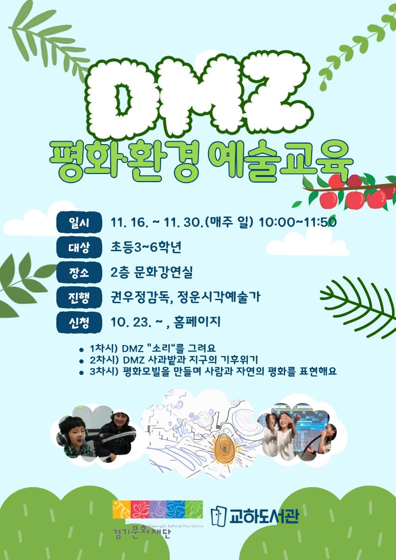[지역연계] DMZ 평화‧환경 예술교육 일시 11. 16.~30.(매주 일) 3차시10:00~11:50 대상 초등3~6학년 장소 2층 문화강연실 진행 권우정감독, 정운시각예술가 ![]() |