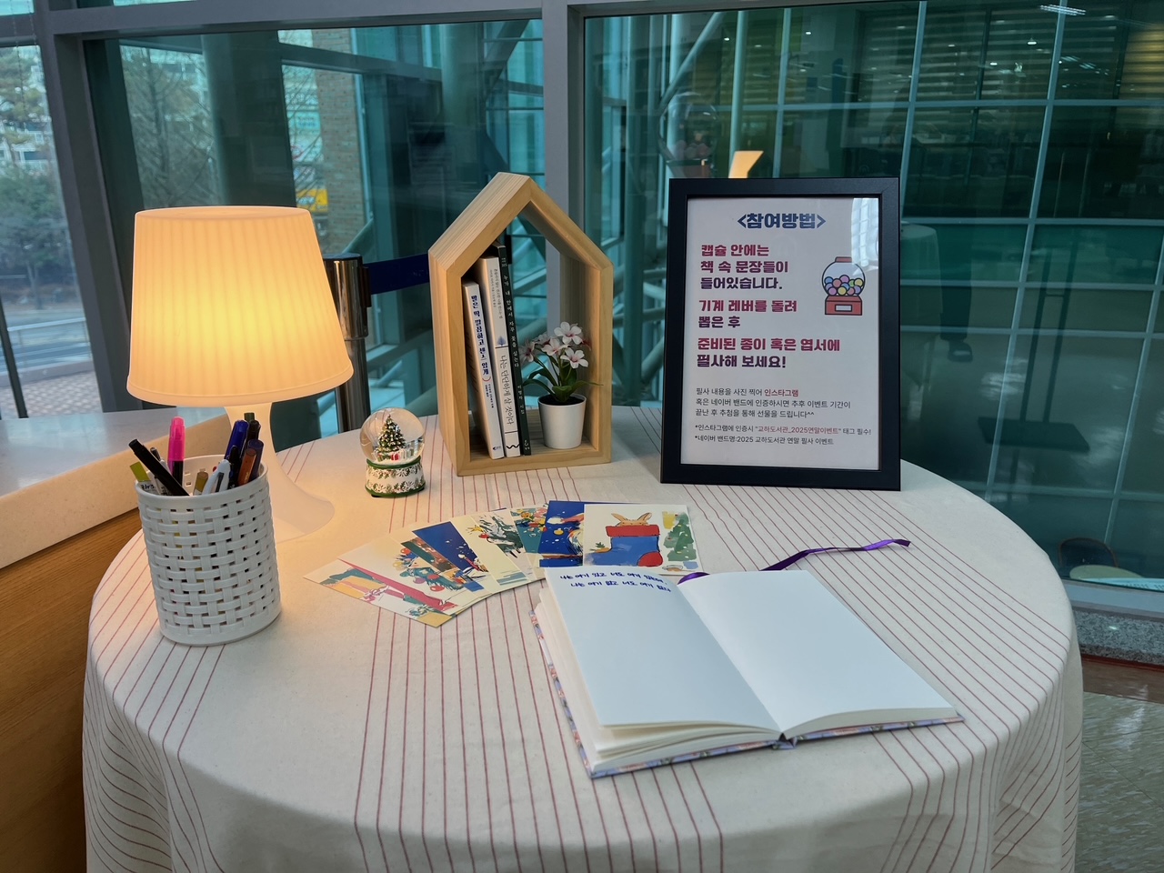 올 한해 잘 보내셨나요? 도서관에 들르셨다면, 문헌정보2실 데스크 옆에 마련된 공간에서 잠시 멈춰 필사가 주는 특별한 쉼을 느껴보세요. 차분히 글을 따라 쓰다 보면 내 생각과 마음에 집중하는 조용한 시간이 자연스럽게 찾아옵니다. **사전신청없이 현장참여하는 이벤트 이며, 자세한 사항은 이벤트공간에 마련된 안내문을 확인해주세요. ![]() ![]() |
