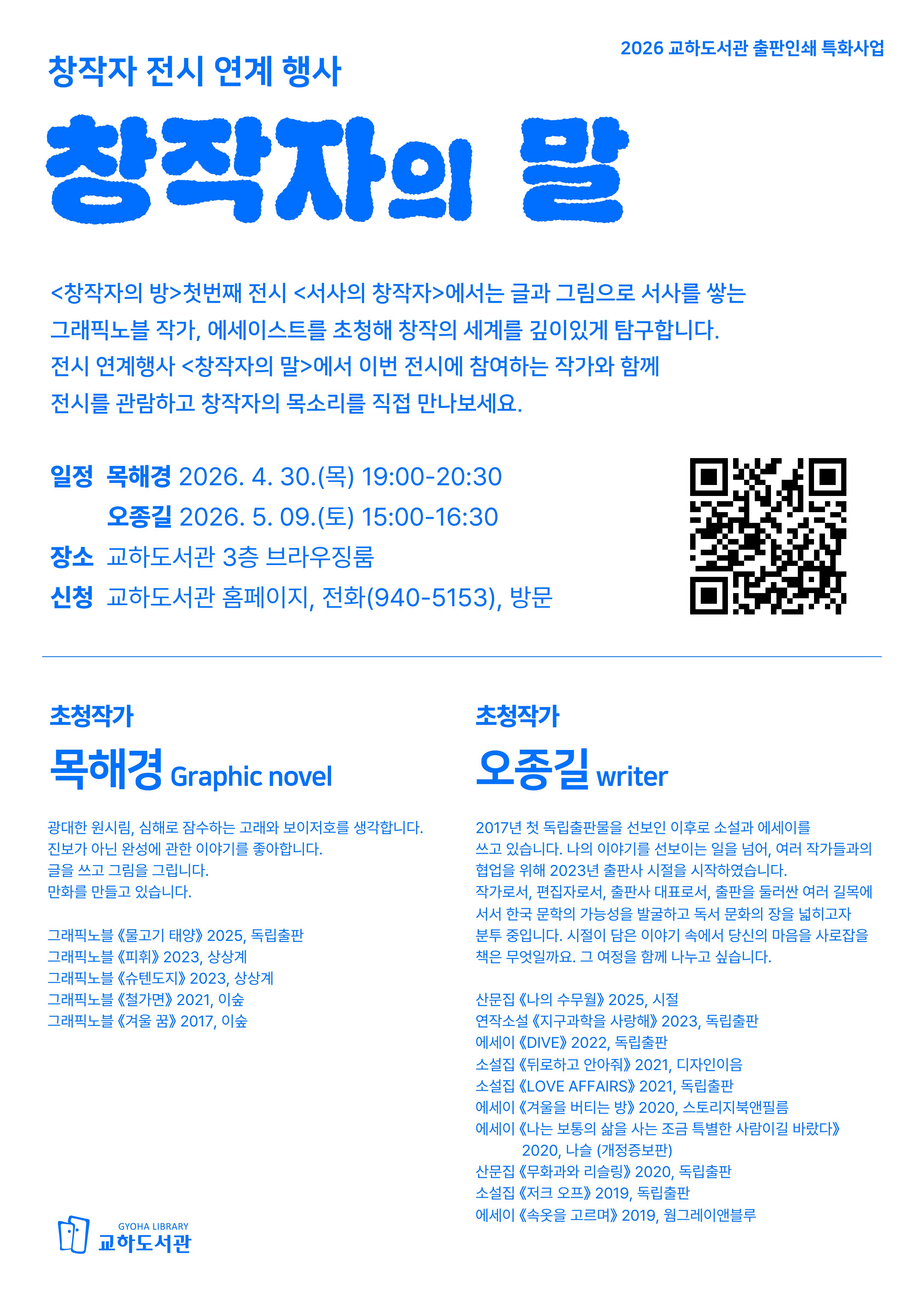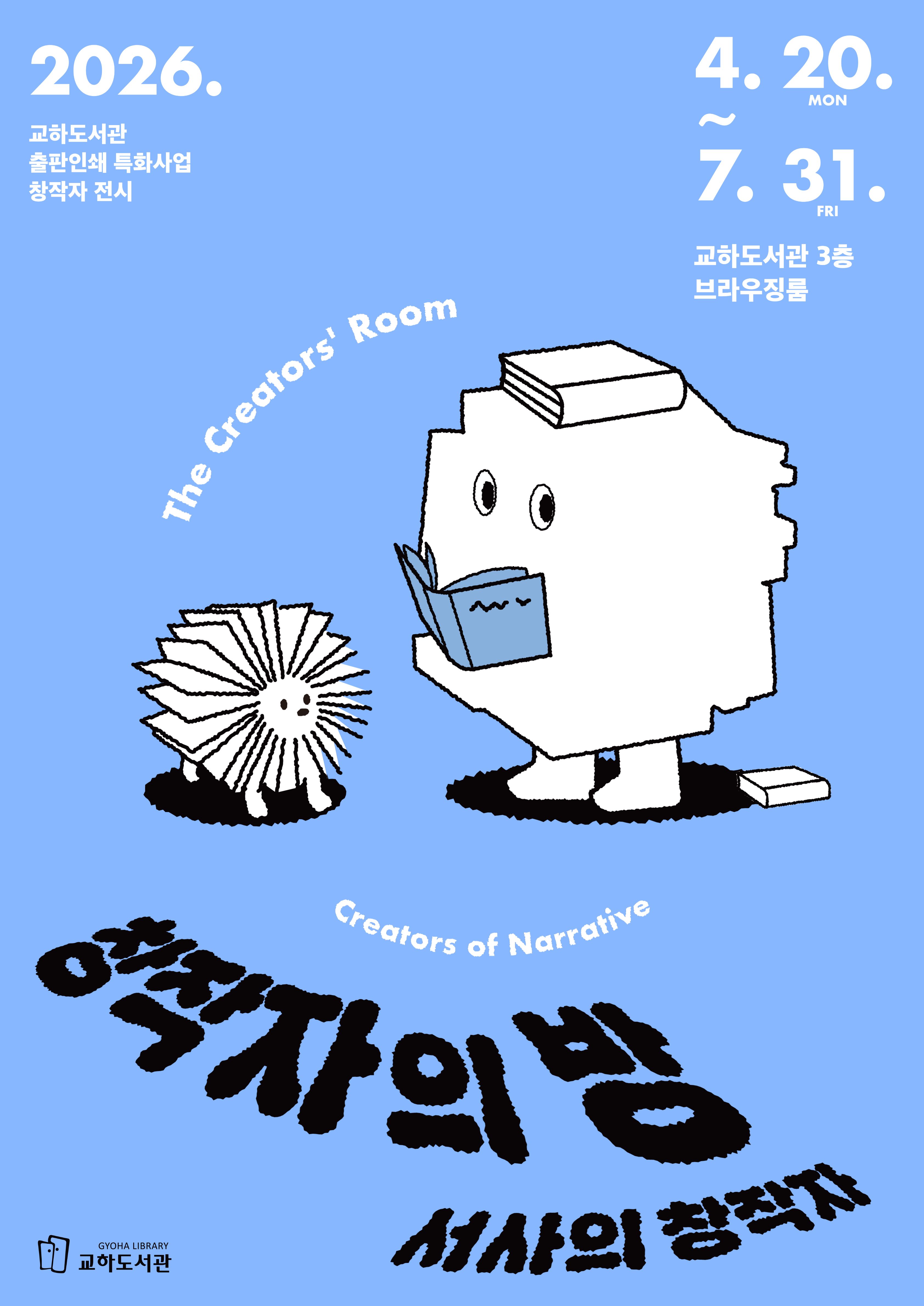 ![]() 2026 교하도서관 출판인쇄 특화사업 창작자 전시 연계행사 <창작자의 말> <창작자의 방> 첫번째 전시 <서사의 창작자>에서는 글과 그림으로 서사를 쌓는 그래픽노블 작가, 에세이스트를 초청해 창작의 세계를 깊이있게 탐구합니다. 전시 연계행사 <창작자의 말>에서 이번 전시에 참여하는 작가와 함께 전시를 관람하고 창작자의 목소리를 직접 만나보세요. 행사일정 목해경 2026. 4. 30.(목) 19:00-20:30 오종길 2026. 5. 09.(토) 15:00-16:30 행사장소 교하도서관 3층 브라우징룸 행사내용 초청작가와 함께 <창작자의 방>전시를 관람하고 창작자의 작업 이야기를 만나보는 시간 참여신청 교하도서관 홈페이지, 전화(940-5153), 방문 ** 전시는 4월 20일부터 3층 브라우징룸에서 운영됩니다 ![]() |