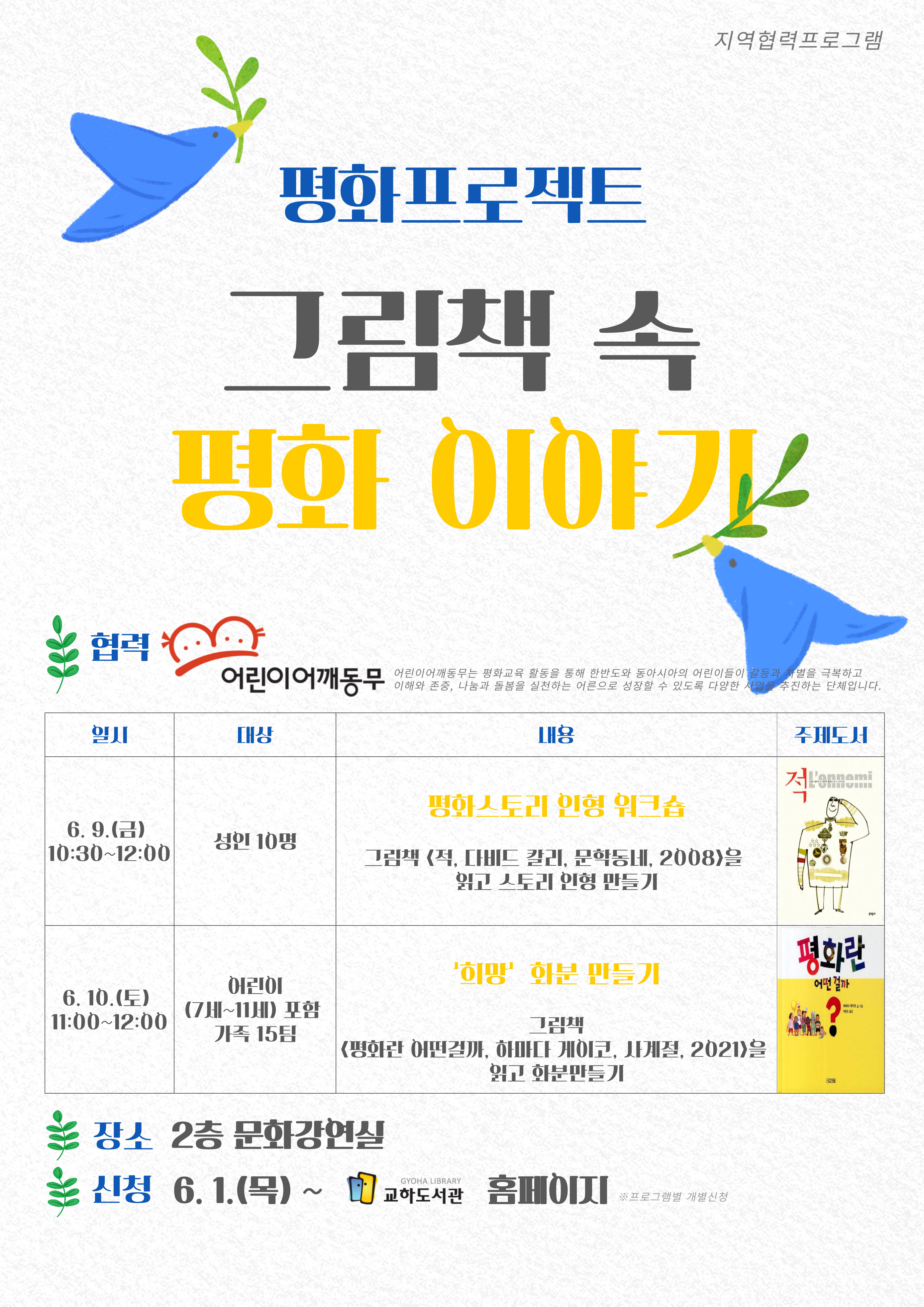 교하도서관과 (사) 어린이어깨동무가 협력하는 프로그램으로 평화에 대해 생각해보는 시간을 마련하였습니다.