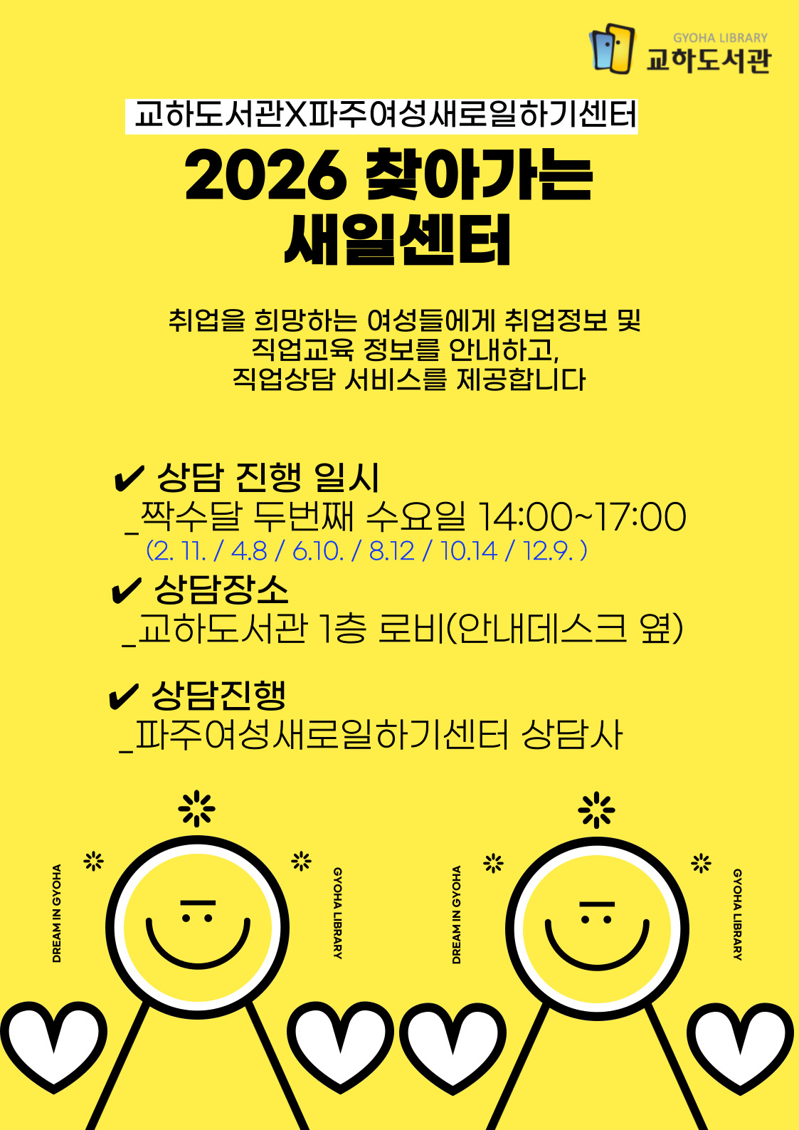 직업교육 정보를 안내하고, 직업상담 서비스를 제공합니다 ✔ 상담 진행 일시 _짝수달 두번째 수요일 14:00~17:00 (2. 11. / 4.8 / 6.10. / 8.12 / 10.14 / 12.9. ) ✔ 상담장소 _교하도서관 1층 로비(안내데스크 옆) ✔ 상담진행 _파주여성새로일하기센터 상담사