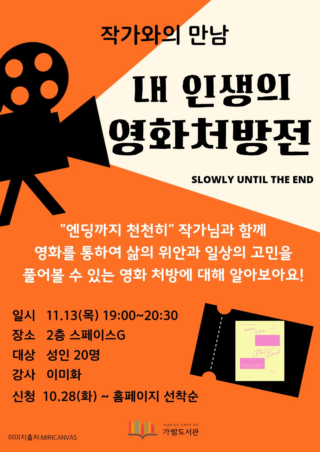 [작가와의 만남] 내 인생의 영화처방전 "엔딩까지 천천히" 작가님과 함께 영화를 통하여 삶의 위안과 일상의 고민을 풀어볼 수 있는 영화 처방에 대해 알아보아요!