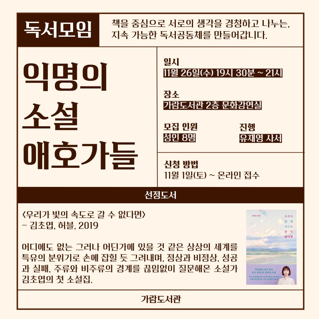 ♦모집이 마감되었습니다. 추후 진행될 독서모임에도 많은 관심 부탁드립니다. 감사합니다.♦![]() 익명의 소설 애호가들 - 책을 중심으로 서로의 생각을 경청하고 나누는, 지속 가능한 독서공동체를 만들어갑니다. 일시 11월 26일(수) 오후 7시 30분~9시(90분) 장소 가람도서관 2층 문화강연실 모집 인원 성인 8명 신청 방법 11월 1일(토)~ 온라인 링크 접속(아래 링크 확인) 선정 도서 ![]() <우리가 빛의 속도로 갈 수 없다면>, 김초엽, 허블, 2019 어디에도 없는 그러나 어딘가에 있을 것 같은 상상의 세계를 특유의 분위기로 손에 잡힐 듯 그려내며, 정상과 비정상, 성공과 실패, 주류와 비주류의 경계를 끊임없이 질문해온 소설가 김초엽의 첫 소설집. - 선정도서를 읽고 참석해주세요. - 본 프로그램은 1회로 종료되며, '익명의 소설 애호가들'의 의견을 담아 향후 긴 호흡의 독서모임을 추진할 예정입니다. |