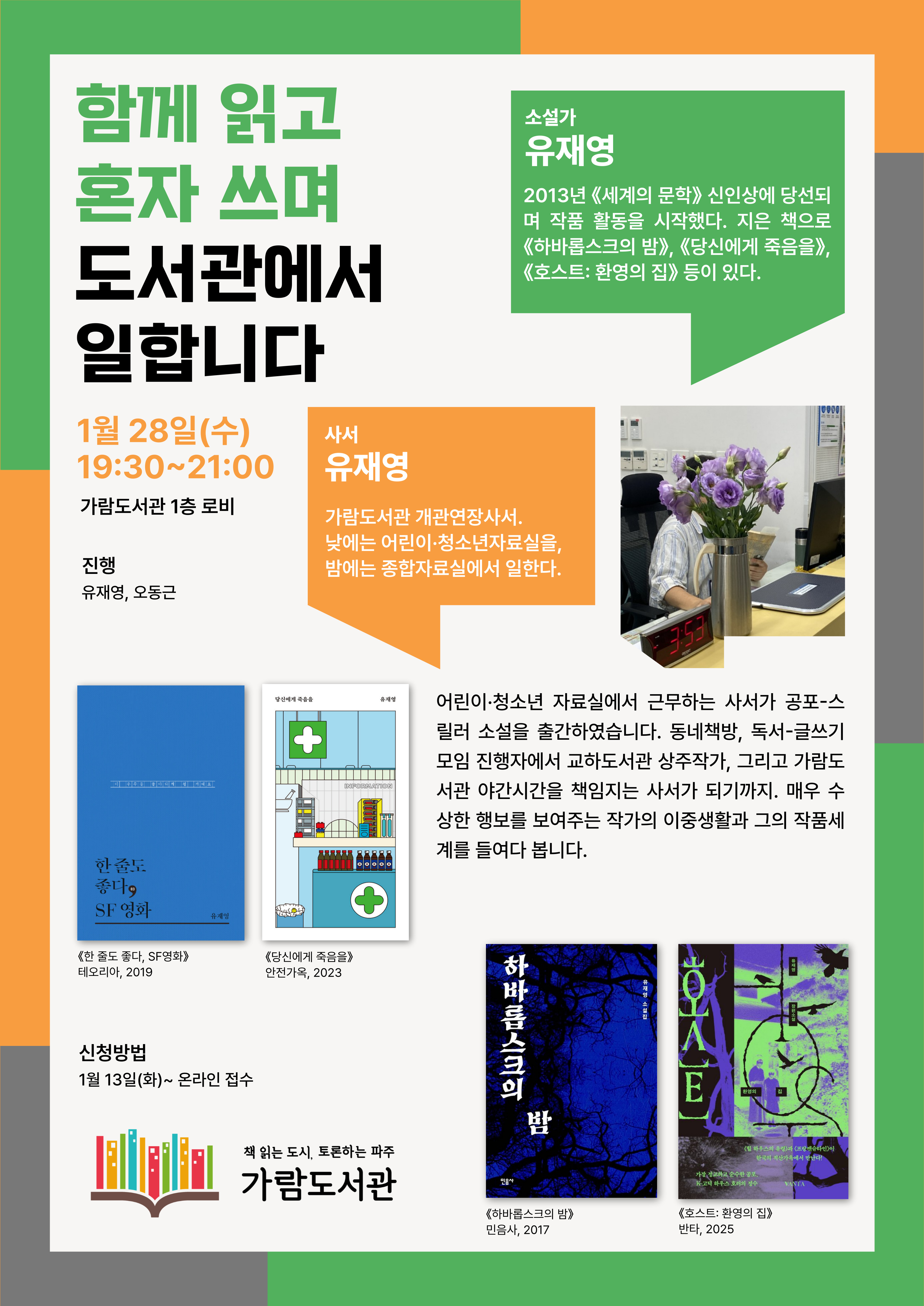 ![]() [작가와의 만남] 함께 읽고 혼자 쓰며 도서관에서 일합니다. 일시 1월 28일(수) 19:30~21:00 장소 가람도서관 1층 로비 대상 지루해 하지 않을 누구나 (주 대상연령은 성인입니다.) 진행 유재영, 오동근 사서 어린이/청소년 자료실에서 근무하는 사서가 공포-스릴러 소설을 출간하였습니다. 동네책방, 독서-글쓰기 모임 진행자에서 교하도서관 상주작가, 그리고 가람도서관 야간시간을 책임지는 사서가 되기까지 매우 수상한 행보를 보여주는 작가의 이중생활과 그의 작품세계를 들여다 봅니다. |