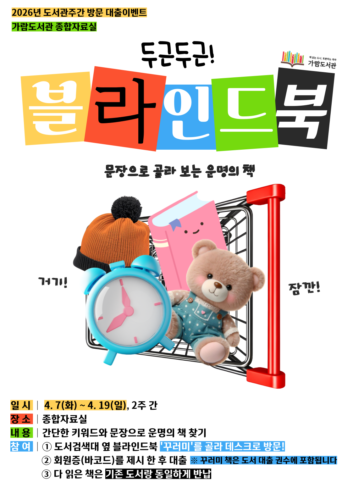 < 두근두근! 블라인드 북 > 일시 : 4. 7(화) ~ 4. 19(일), 2주간 장소 : 종합자료실 내용 : 간단한 키워드 문장으로 운명의 책 찾기 참여 : ①도서검색대 옆 블라인드북 '꾸러미'를 골라 데스크로 방문! ②회원증(바코드) 제시 후 대출 ※꾸러미 책은 도서 대출 권수에 포함됩니다(각1권) ③다 읽은 책은 기존 도서와 동일하게 반납 문의 : 종합자료실 031-949-2552 ※ 꾸러미 도서 소진 시 이벤트는 조기종료될 수 있습니다 |