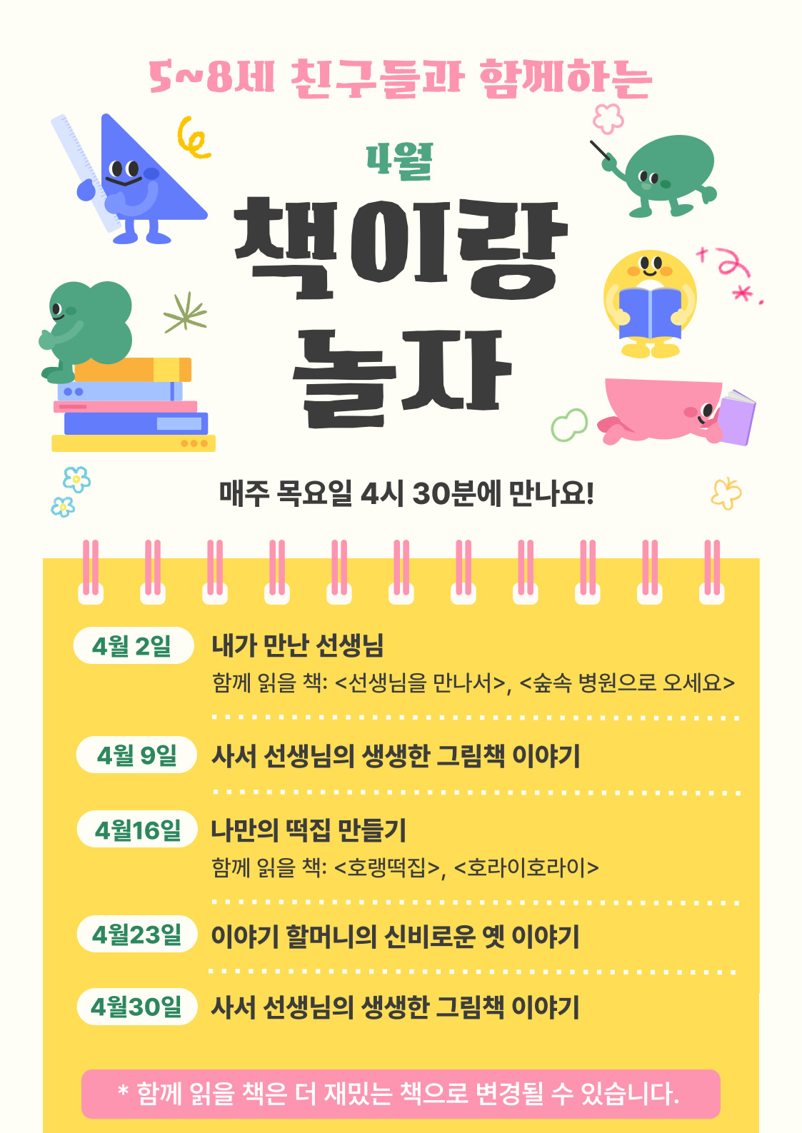 [목요책놀이] 책이랑 놀자 5~8살 친구들에게 책과 놀이를 함께 즐길 수 있게 해주는 책이랑 놀자! 생생한 그림책 낭독과 책놀이가 궁금하시다면 놀러오세요~ 책이랑 놀자는 매주 목요일 오후 4시 30분에 진행됩니다. 4월 2일 내가 만난 선생님 (함께 읽을 책: <선생님을 만나서>, <숲속 병원으로 오세요>) 4월 9일 사서 선생님의 생생한 그림책 이야기 4월 16일 나만의 떡집 만들기 (함께 읽을 책: <호랭떡집>, <호라이호라이>) 4월 23일 이야기 할머니의 신비로운 옛 이야기 4월 30일 사서 선생님의 생생한 그림책 이야기 * 함께 읽을 책은 더 재밌는 책으로 변경될 수 있습니다. 사전신청없이 자료실에서 바로 참여하는 프로그램입니다 :)