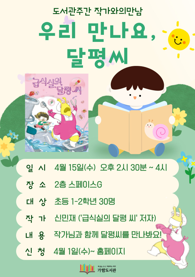 ![]() [도서관주간 작가와의만남] 우리 만나요, 달평씨 일시 4월 15일(수) 오후 2시 30분 ~ 4시 장소 2층 스페이스G 대상 초등 1-2학년 30명 작가 신민재('급식실의 달평 씨' 저자) 내용 작가님과 함께 달평씨를 만나봐요! 신청 4월 1일(수)~ 홈페이지 |