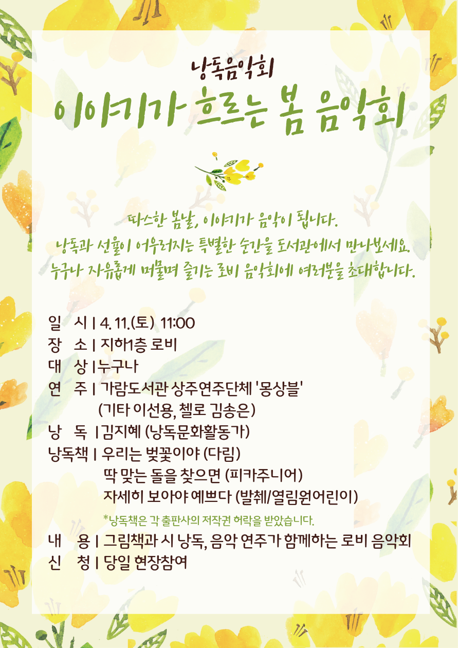| 프로그램명 | 예정 [도서관주간 낭독음악회] 이야기가 흐르는 봄 음악회 |