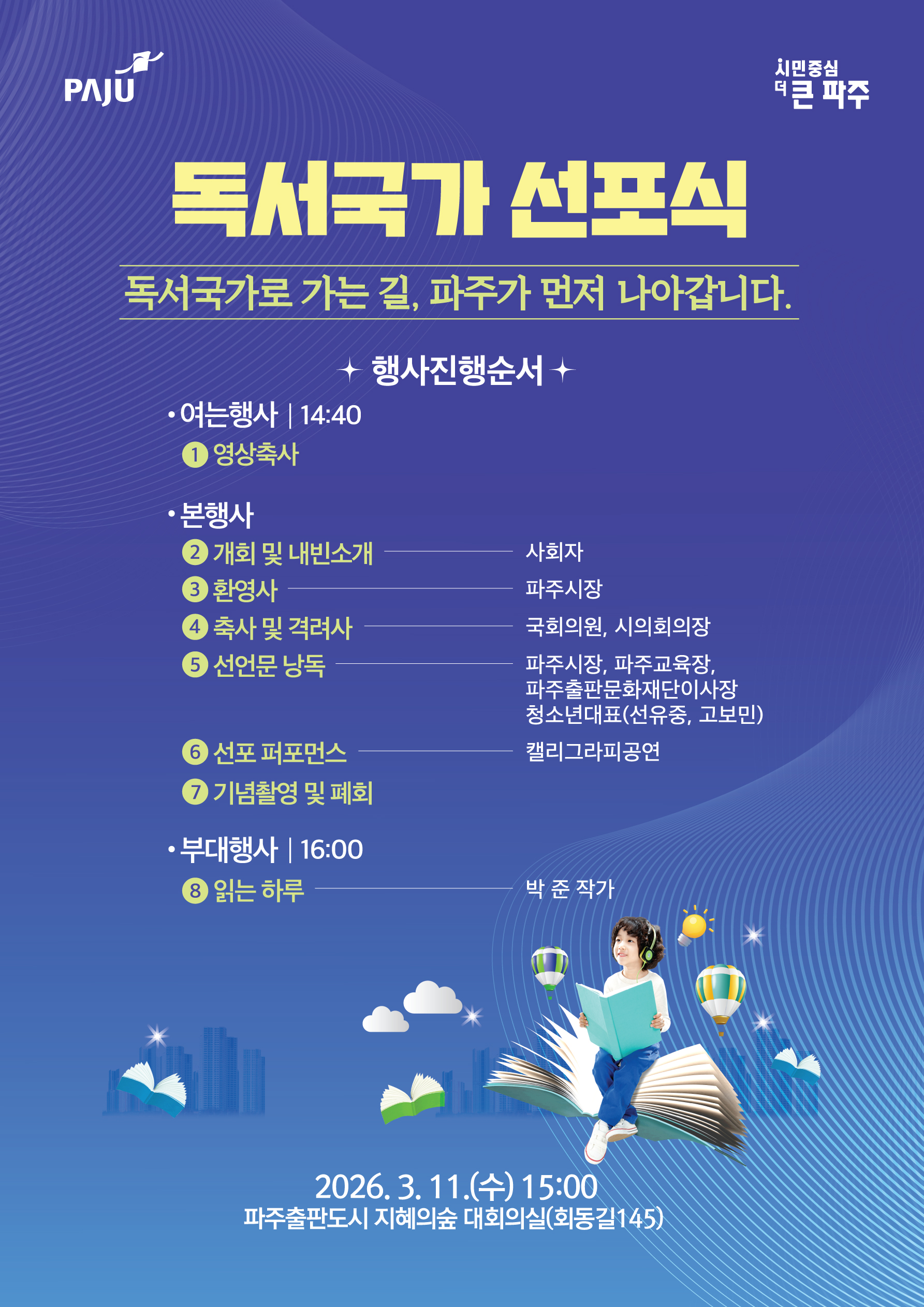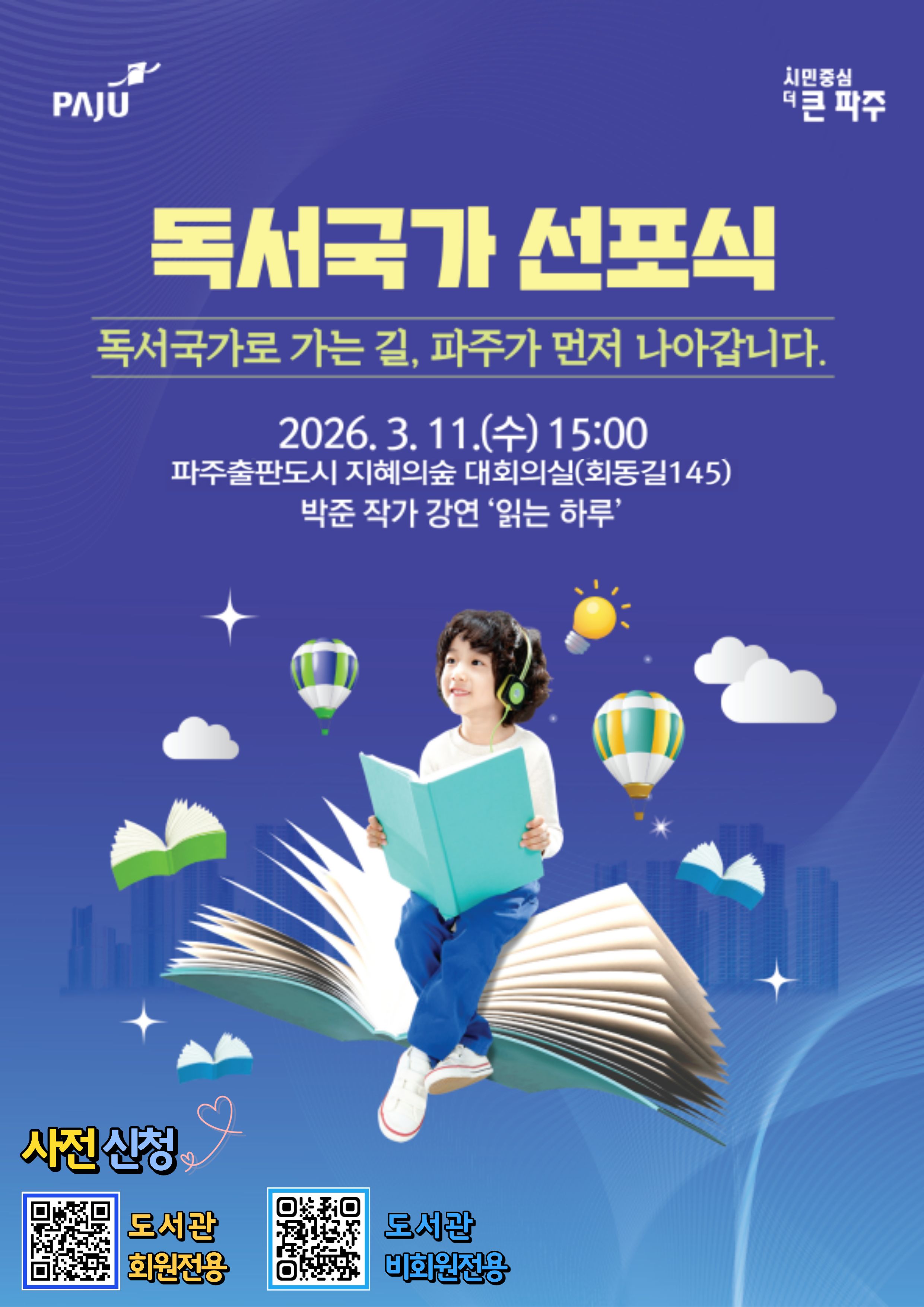 독서국가 선포식에 초대합니다. 독서국가로 가는 길, 파주가 먼저 나아갑니다. 파주시는 대한민국 국회 '독서 국가' 정책에 적극 동참하고 독서문화 확산을 위하여 <파주시 독서국가 선포식>을 개최해 독서생태계의 지속적인 발전과 상호협력체계를 강화를 도모하고합니다. 많은 관심 부탁드리며, 참석하셔서 자리를 빛내주시기 바랍니다. 신청 : https://m.site.naver.com/22bTi ![]()
