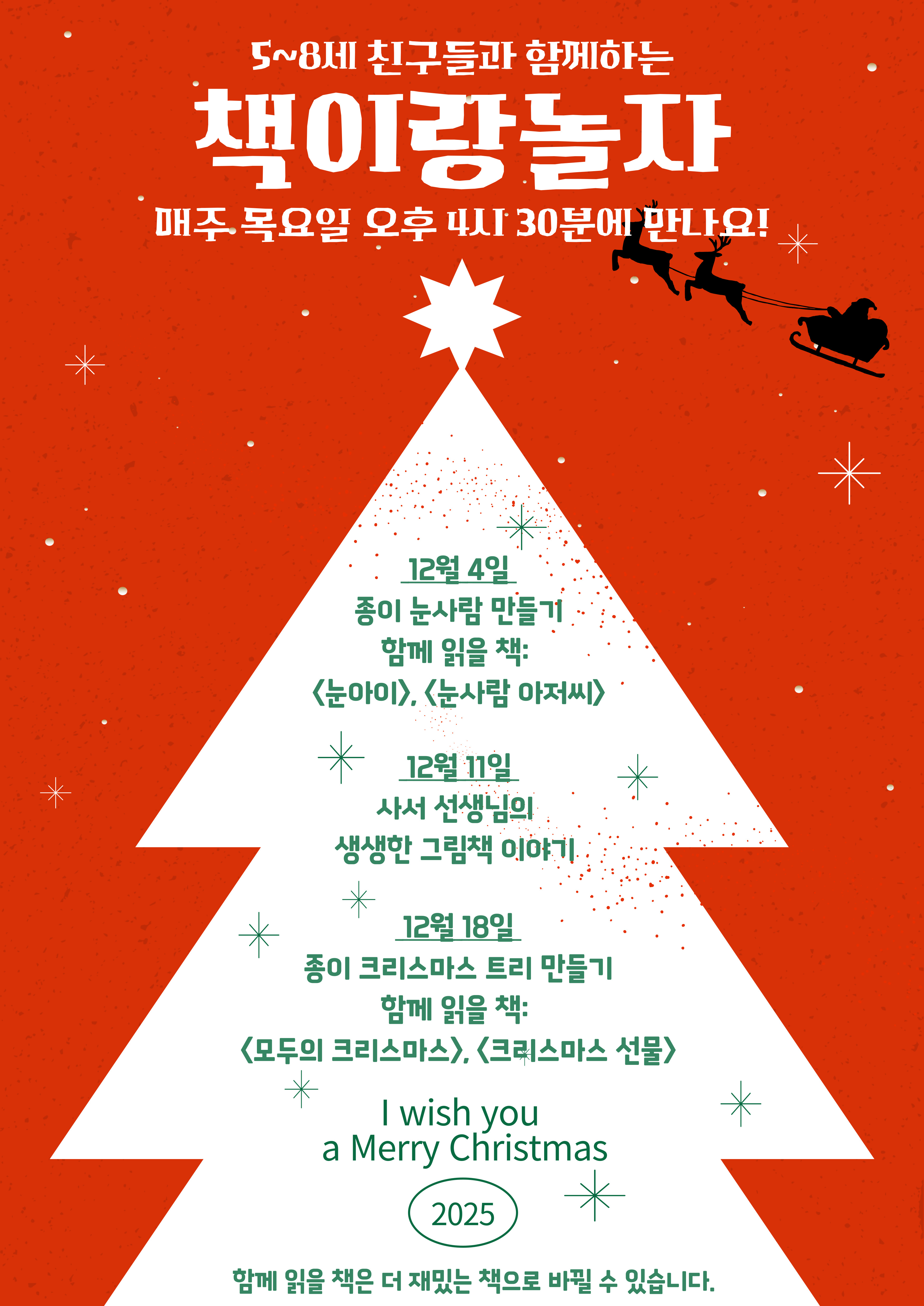 ![]() [목요책놀이] 책이랑 놀자 5~8살 친구들에게 책과 놀이를 함께 즐길 수 있게 해주는 책이랑 놀자! 생생한 그림책 낭독과 책놀이가 궁금하시다면 놀러오세요~ 책이랑 놀자는 매주 목요일 오후 4시 30분에 진행됩니다. 12월 4일 종이 눈사람 만들기(함께 읽을 책: <눈아이>, <눈사람 아저씨>) 12월 11일 사서 선생님의 생생한 그림책 이야기 12월 18일 종이 크리스마스 트리 만들기(함께 읽을 책: <모두의 크리스마스>, <크리스마스 선물>) * 함께 읽을 책은 더 재밌는 책으로 변경될 수 있습니다. 사전신청없이 자료실에서 바로 참여하는 프로그램입니다 :) |