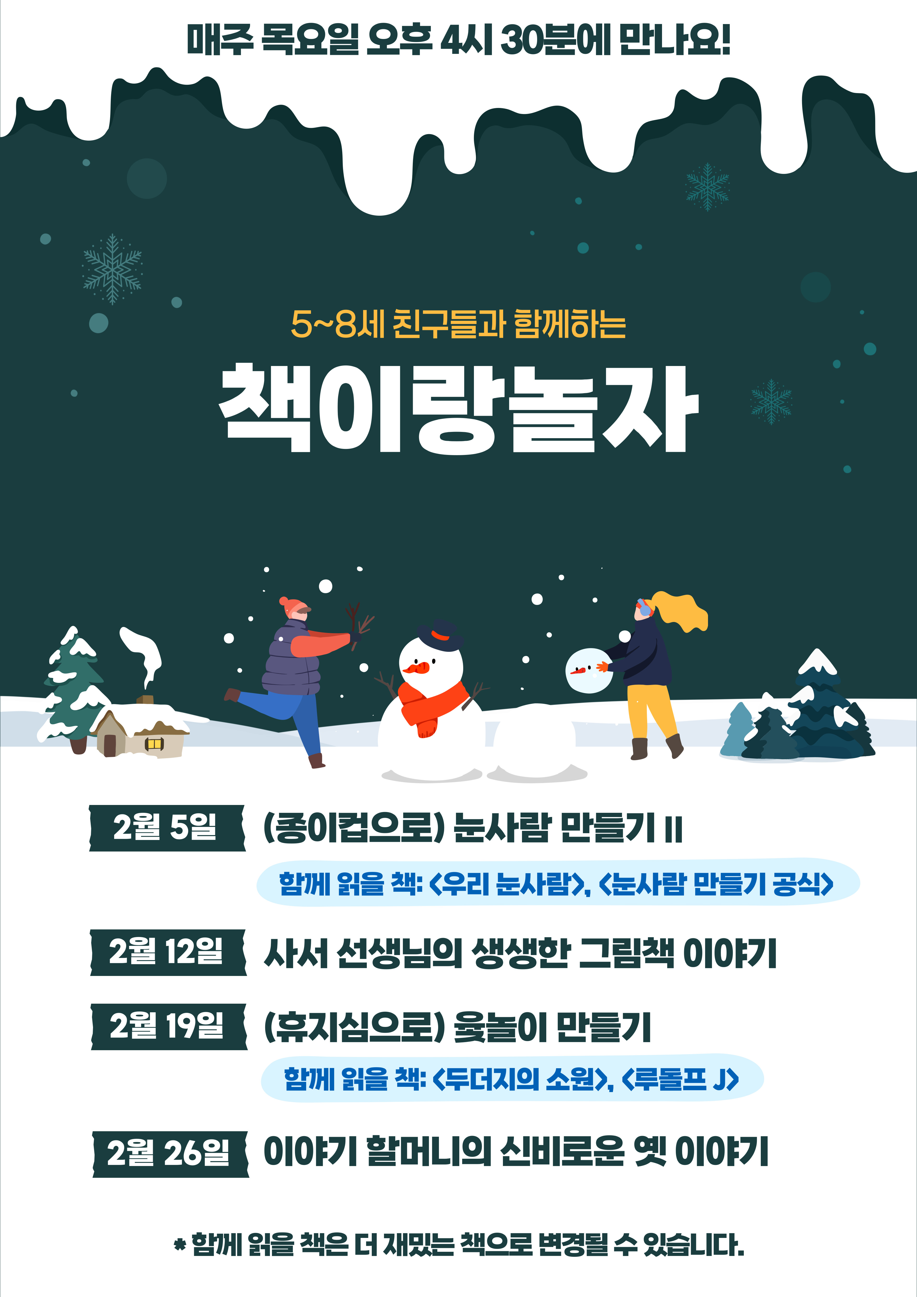 ![]() [목요책놀이] 책이랑 놀자 5~8살 친구들에게 책과 놀이를 함께 즐길 수 있게 해주는 책이랑 놀자! 생생한 그림책 낭독과 책놀이가 궁금하시다면 놀러오세요~ 책이랑 놀자는 매주 목요일 오후 4시 30분에 진행됩니다. 2월 5일 (종이컵으로) 눈사람 만들기 2 (함께 읽을 책: <우리 눈사람>, <눈사람 만들기 공식>) 2월 12일 사서 선생님의 생생한 그림책 이야기 2월 19일 (휴지심으로) 윷놀이 만들기 (함께 읽을 책: <두더지의 소원>, <루돌프 J>) 2월 26일 이야기 할머니의 신비로운 옛 이야기 * 함께 읽을 책은 더 재밌는 책으로 변경될 수 있습니다. 사전신청없이 자료실에서 바로 참여하는 프로그램입니다 :) |