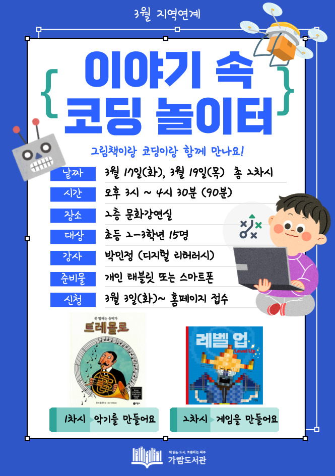 ![]() [지역연계] 이야기 속 코딩 놀이터 그림책이랑 코딩이랑 함께 만나요! 날짜 3월 17일(화), 3월 19일(목) 총2차시 시간 오후 3시 ~ 4시 30분 장소 2층 문화강연실 대상 초등 2~3학년 15명 강사 박민정 (디지털 리터러시) 준비물 개인 태블릿 또는 스마트폰 신청 3월 3일(화)~ 홈페이지 접수 *프로그램 참여 전 수업시 사용할 어플을 미리 설치해야 합니다. (어플은 별도 공지 예정) *신청시 비고란에 학년을 반드시 적어주세요.