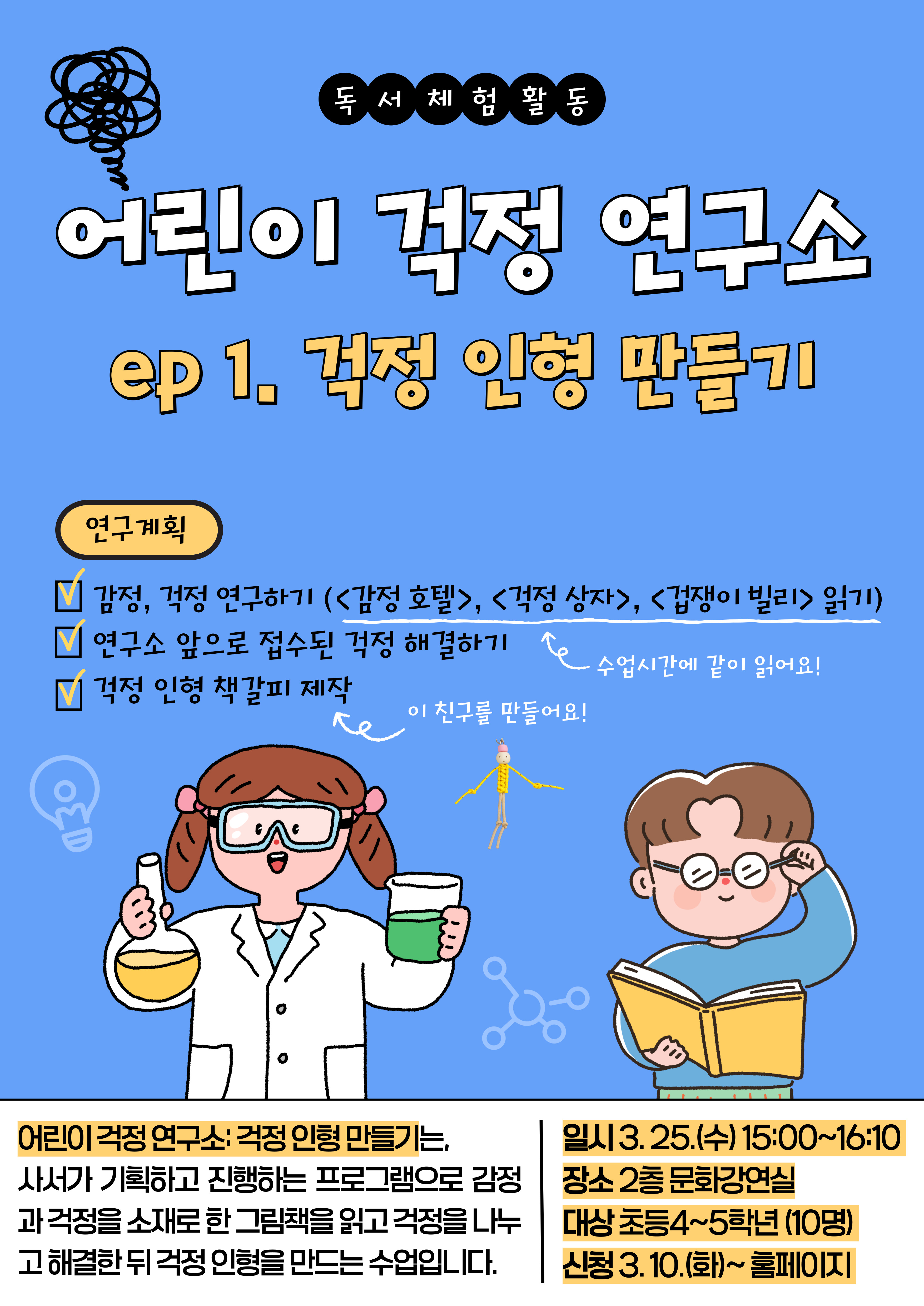 | 프로그램명 | 접수중 [독서체험활동] 어린이 걱정 연구소: 걱정 인형 만들기 |