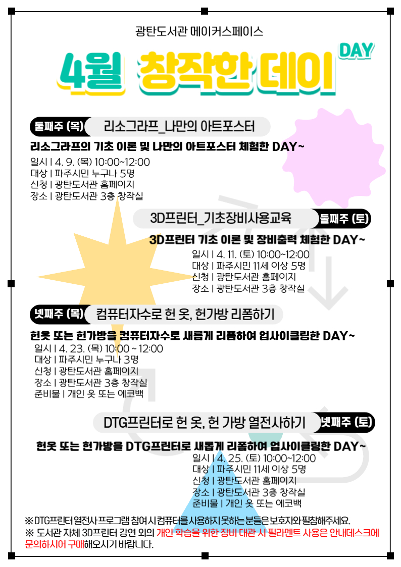※ 개인 옷 또는 에코백을 준비물로 지참해주세요. (에코백은 A4사이즈 이상, 너무 두껍지 않은 천가방)![]() [광탄도서관 메이커스페이스] 창작한데이DAY- 내 옷, 내 에코백 자수 리폼하여 업사이클링 한 DAY 일시 4. 23. (목) 10:00~12:00 장소 3층 창작실 대상 파주시민 누구나 3명 (11세 이하 보호자 동반 필수) 신청 광탄도서관 홈페이지 접수(선착순 마감) 내용 개인 옷 또는 에코백에 원하는 레터링 또는 이미지를 자수하여 새롭게 재활용하기 문의 031-940-5827 |