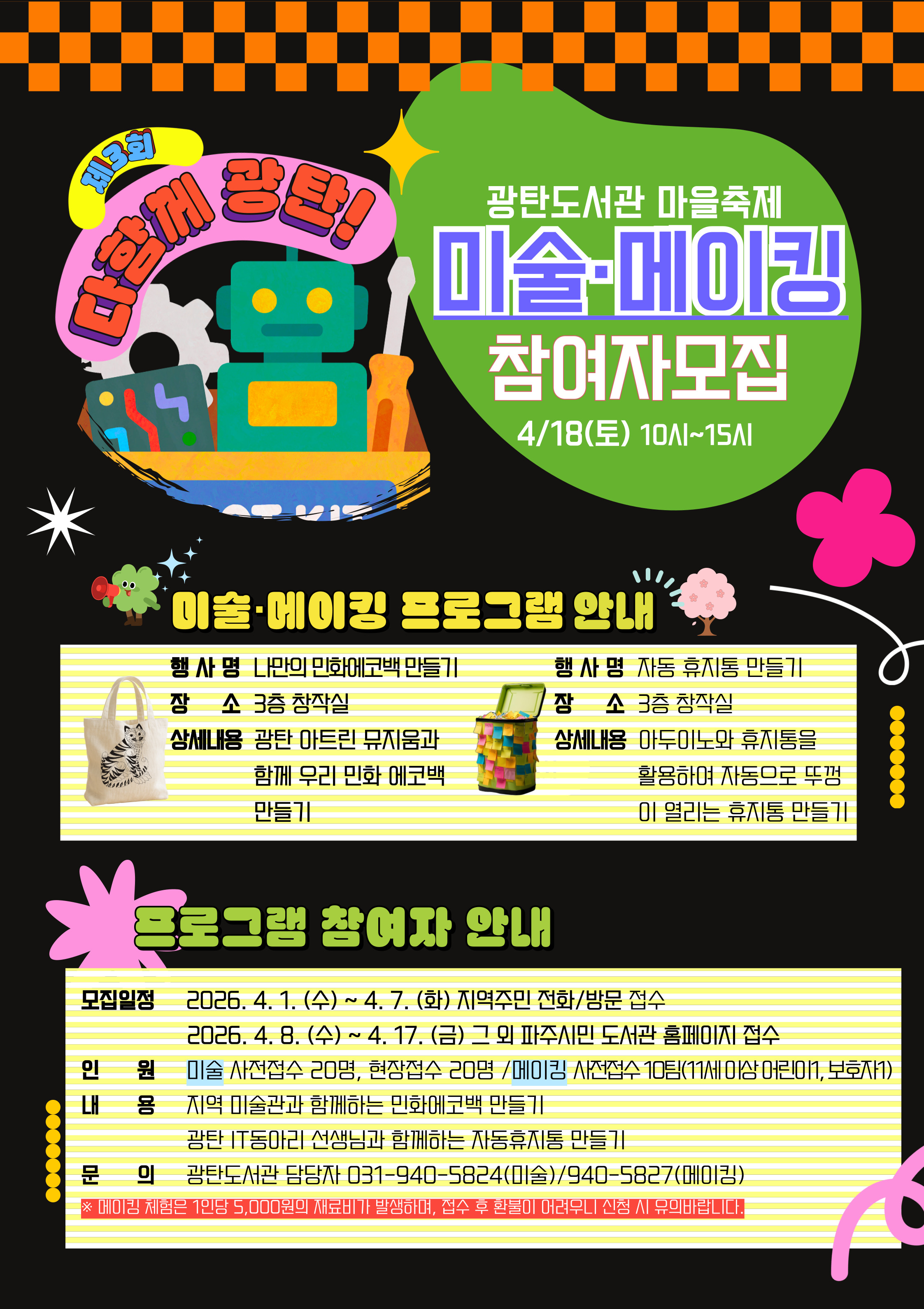 도서관 마을축제 <메이킹 체험- 열려라 휴지통!> 참여자 모집 ※ 재료비(5,000원)가 부과되는 체험입니다. 프로그램 신청 후 개별 문자를 통해 재료비 관한 사항을 안내드립니다. ※ 재료비 입금 후에는 환불이 어려우니 신중하게 고민하시어 참여해주시고, 안내일자까지 재료비 입금이 안되면 프로그램 신청이 자동취소 될 예정입니다. ![]() 일시 2026. 4. 18. (토) 13:00~15:00 강사 김석현(메이킹 강사) 장소 3층 창작실 내용 아두이노와 휴지통을 활용하여 자동으로 뚜껑이 열리는 휴지통 만들기 접수방법 - 광탄주민 4. 1. (수) ~ 4. 7. (화) 방문/전화 우선접수(☎ 031-940-5820) - 기타 파주시민 4. 8. (수) ~ 4. 16. (목) 홈페이지 접수 재료비 안내 ※ 재료비(5,000원)가 부과되는 체험입니다. 프로그램 신청 후 개별 문자를 통해 재료비 관한 사항을 안내드립니다. ※ 재료비 입금 후에는 환불이 어려우니 신중하게 고민하시어 참여해주시고, 안내일자까지 재료비 입금이 안되면 프로그램 신청이 자동취소 될 예정입니다. |