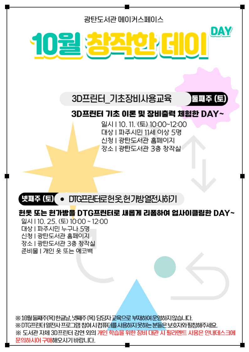 ※ 개인 옷 또는 에코백을 준비물로 지참해주세요. (에코백은 A4사이즈 이상, 너무 두껍지 않은 천가방)![]() [광탄도서관 메이커스페이스] 창작한데이DAY - DTG프린터로 헌옷, 헌에코백 열전사하기 일시 10. 25. (토) 10:00 ~ 12:00 장소 3층 창작실 대상 파주시민 누구나 5명(컴퓨터 미사용자 보호자 필참) 신청 광탄도서관 홈페이지 접수(선착순 마감) 내용 DTG프린터를 활용하여 헌옷 또는 헌에코백에 열전사하여 업사이클링하기 문의 031-940-5827 |