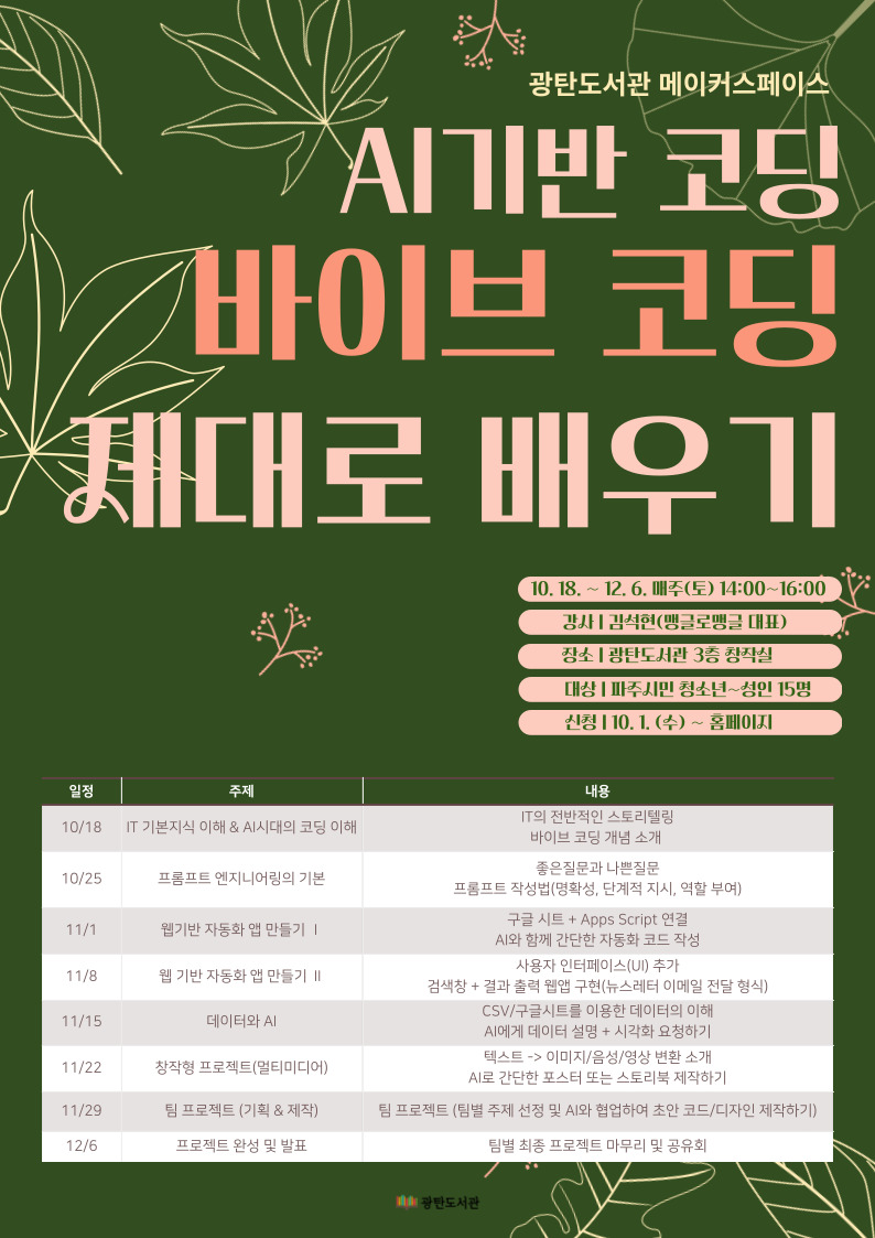 프로그램명 | 접수마감 [광탄도서관 메이커스페이스] AI기반 코딩, 바이브코딩 제대로 배우기! |