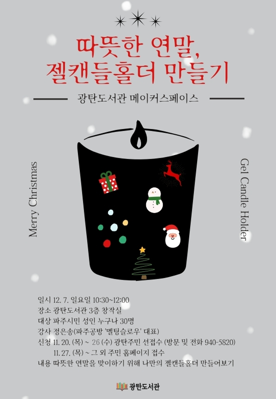 ○ 운영장소: 광탄도서관 3층 창작실 ○ 운영대상: 파주시민 성인 30명 내외 ○ 신청방법: 11. 20. (목) ~ 11. 26. (수) 광탄주민 방문 및 전화 접수 11. 27. (목) ~ 12. 6. (토) 그 외 주민 홈페이지 접수 ○ 운영강사: 정은송(파주지역공방 '멜팅슬로우' 대표) ○ 운영내용: 와인컵을 활용한 나만의 크리스마스 젤캔들홀더를 만들어보며, 따뜻한 연말 보내기 |