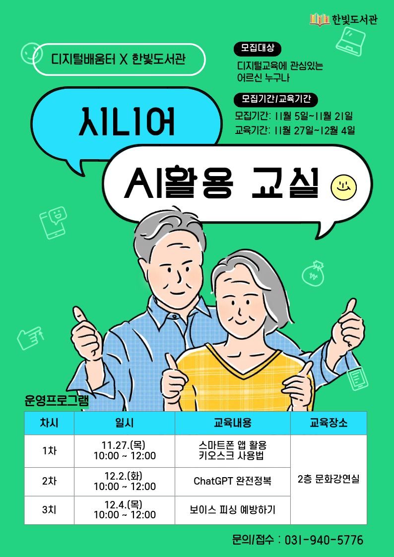 시니어 대상 디지털 역량강화 교육입니다. 스마트폰의 안전한 사용법으로 보이스 피싱을 예방하고 ChatGPT 활용법도 배워보세요! ![]() 교육명 : 시니어 AI활용교육 일 시 : 2025년 11월 27일(목)/12월 2일(화)/12월 4일(목) 10:00~12:00 장 소 : 2층 문화강연실 대 상 : 만55세~75세 (10명) 강 사 : 박지연 (디지털배움터 강사) ※일정에 따라 강사가 바뀔 수 있음 신 청 : 2025년 11월 5일(수)~ 홈페이지,전화,방문 접수 문 의: 031-940-5776 (종합자료실) |