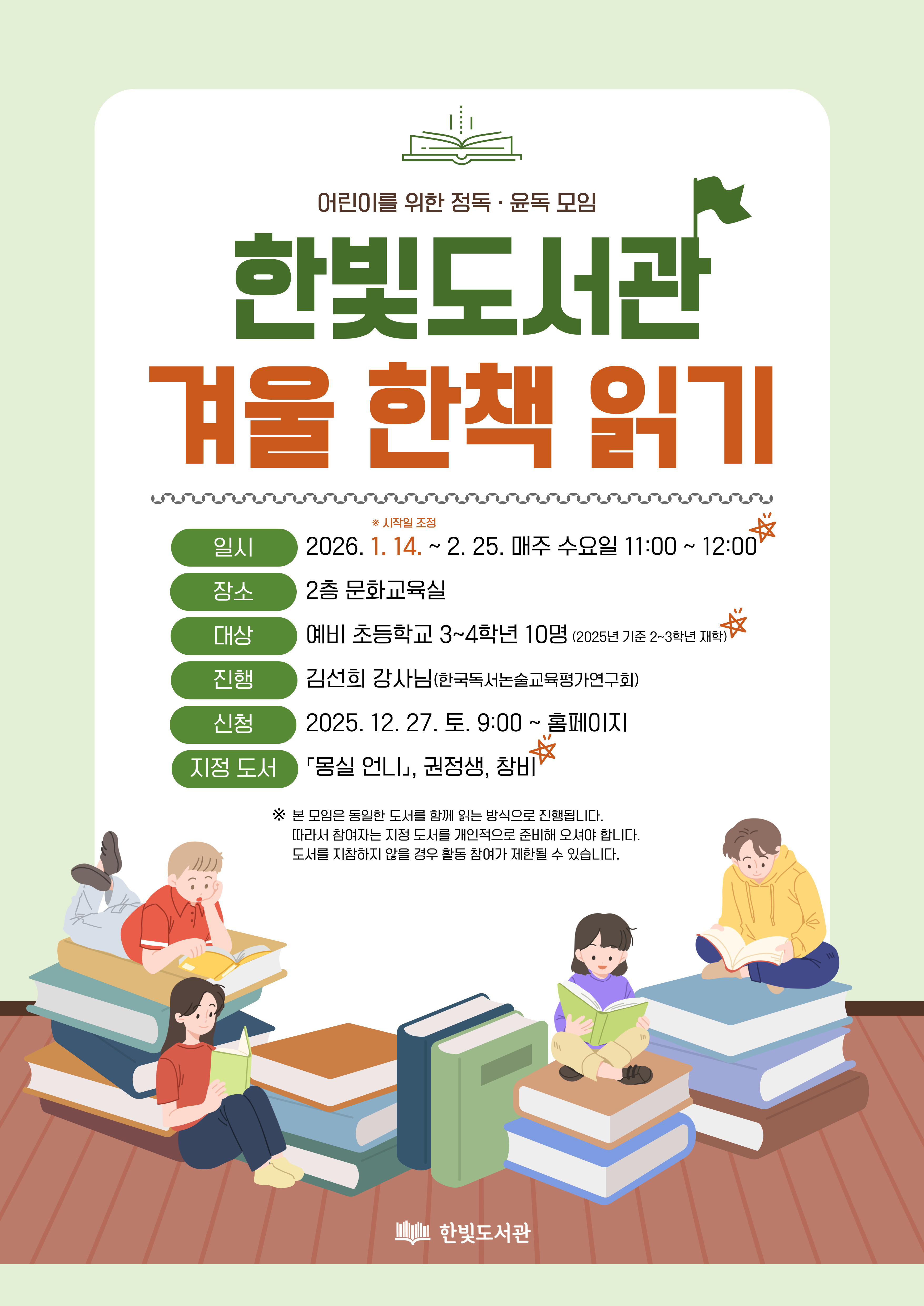 ※ 이 페이지는 예비 3~4학년 분반 신청 페이지입니다. ※ 이 페이지는 예비 3~4학년 분반 신청 페이지입니다. ※ 이 페이지는 예비 3~4학년 분반 신청 페이지입니다. [한빛] 어린이 윤독모임 <겨울 한책 읽기> 어린이들이 책을 천천히 깊게 읽고, 함께 소리 내어 읽으며 자연스럽게 이해력을 높여가는 어린이 독서 모임이에요 정독을 통해 집중력·어휘력·사고력을 키우고, 윤독을 통해 발음·표현력·자신감까지 함께 자라납니다. * 정독 精讀 뜻을 새겨 가며 자세히 읽음. * 윤독 輪讀 여러 사람이 같은 글이나 책을 돌려 가며 읽음. 한 문장 한 문장을 함께 읽고 이야기 나누다 보면 책 속 내용이 더 쉽게 이해되고, 생각이 깊어지는 경험을 하게 될 거예요. 책을 좋아하는 친구도, 아직 읽기가 낯선 친구도 따뜻한 분위기에서 편하게 참여할 수 있습니다. ※ 시작일 조정 및 차시 수정 ■ 일시 │ 2026. 1. 14. ~ 2. 25. 매주 수요일 11:00~12:00 (총 6차시) ※설 연휴 2.18(수) 제외 ■ 대상 │ 예비 초등 3~4학년 10명 (2025년 기준 2~3학년 재학) ■ 내용 │ 권정생 작가님의 「몽실 언니」를 돌아가며 소리 내어 읽고, 읽은 내용에 대한 생각을 나누는 시간 ■ 진행 │ 김선희 강사님(한국독서논술교육평가연구회) ■ 장소 │ 2층 문화교육실 ■ 신청 │ 2025.12.27. (토) 09:00 ~ 홈페이지 선착순 접수 ■ 문의 │ 031-940-5787 ※ 모임의 원활한 진행을 위해, 결석이나 중도 하차 없이 6차시 모두 참여 가능한 어린이들의 신청을 기다립니다. ※ 본 모임은 동일한 도서를 함께 읽는 방식으로 진행됩니다. 따라서 참여자는 지정 도서를 개인적으로 준비해 오셔야 합니다. 도서를 지참하지 않을 경우 활동 참여가 제한될 수 있습니다.