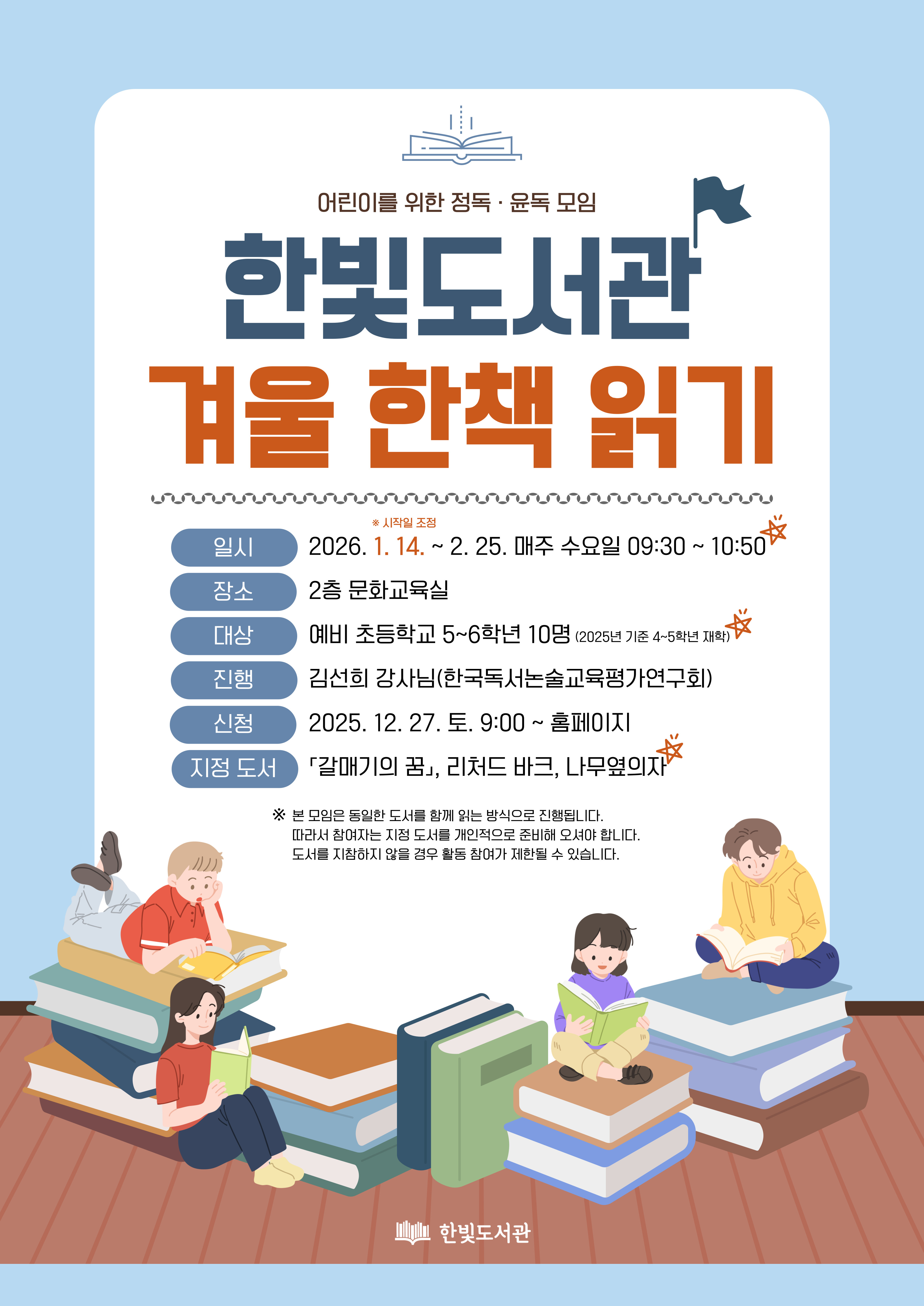 ※ 이 페이지는 예비 5~6학년 분반 신청 페이지입니다. ※ 이 페이지는 예비 5~6학년 분반 신청 페이지입니다. ※ 이 페이지는 예비 5~6학년 분반 신청 페이지입니다. [한빛] 어린이 윤독모임 <겨울 한책 읽기> 어린이들이 책을 천천히 깊게 읽고, 함께 소리 내어 읽으며 자연스럽게 이해력을 높여가는 어린이 독서 모임이에요 정독을 통해 집중력·어휘력·사고력을 키우고, 윤독을 통해 발음·표현력·자신감까지 함께 자라납니다. * 정독 精讀 뜻을 새겨 가며 자세히 읽음. * 윤독 輪讀 여러 사람이 같은 글이나 책을 돌려 가며 읽음. 한 문장 한 문장을 함께 읽고 이야기 나누다 보면 책 속 내용이 더 쉽게 이해되고, 생각이 깊어지는 경험을 하게 될 거예요. 책을 좋아하는 친구도, 아직 읽기가 낯선 친구도 따뜻한 분위기에서 편하게 참여할 수 있습니다. ※ 시작일 조정 및 차시 수정 ■ 일시 │ 2026. 1. 14. ~ 2. 25. 매주 수요일 09:30~10:50 (총 6차시) ※설 연휴 2.18(수) 제외 ■ 대상 │ 예비 초등 5~6학년 10명 (2025년 기준 4~5학년 재학) ■ 내용 │ 리처드 바크의 「갈매기의 꿈」를 돌아가며 소리 내어 읽고, 읽은 내용에 대한 생각을 나누는 시간 ■ 진행 │ 김선희 강사님(한국독서논술교육평가연구회) ■ 장소 │ 2층 문화교육실 ■ 신청 │ 2025.12.27. (토) 09:00 ~ 홈페이지 선착순 접수 ■ 문의 │ 031-940-5787 ※ 모임의 원활한 진행을 위해, 결석이나 중도 하차 없이 6차시 모두 참여 가능한 어린이들의 신청을 기다립니다. ※ 본 모임은 동일한 도서를 함께 읽는 방식으로 진행됩니다. 따라서 참여자는 지정 도서를 개인적으로 준비해 오셔야 합니다. 도서를 지참하지 않을 경우 활동 참여가 제한될 수 있습니다.