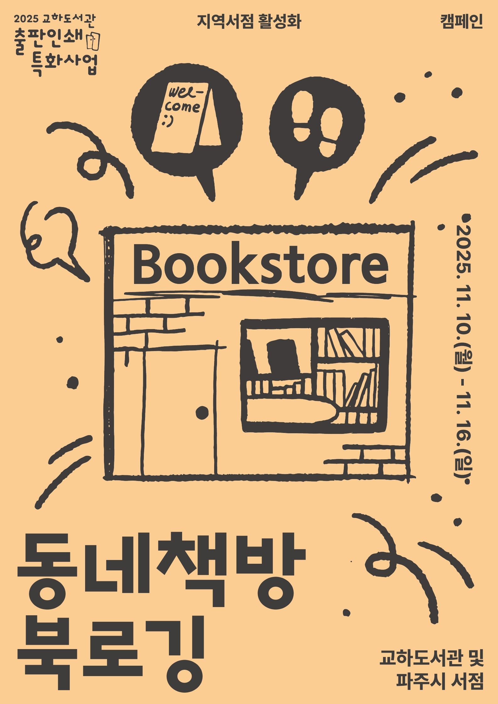 ![]() 2025 교하도서관 출판인쇄 특화사업 | 지역서점 활성화 캠페인 동네책방 북로깅Book+plogging 동네책방 북로깅? Book+plogging 조깅하며 쓰레기를 줍는 '플로깅'처럼 동네서점을 산책하고 책과 지식을 얻는다는 의미 11월 11일 서점의 날을 맞이해 일주일동안 우리동네 서점을 소개하는 캠페인을 진행합니다. 교하도서관 서점주간(11.10.-11.16.)동안 우리동네 책방을 산책하며 새로운 책을 발견하는 재미를 만나보세요! 참여기간 11.10.(월) ~ 16.(일) (7일) 참여장소 <동네책방 북로깅> 참여서점 12개소 참여방법 ① 교하도서관 또는 참여서점에서 포스터(응모권) 수령 ② 미션 두 가지 중 한가지 이상 참여 후 [응모권] 제출 응모기간 11.10.(월) ~ 23.(일) (2주) 응모장소 교하도서관 1층 로비 응모함 제출 추첨결과 11. 26.(수) 추첨 후 당첨자 대상 기프티콘 발송 예정 미션내용 필수 출판인쇄특화 인스타그램(@gyohalib_smalltable) 팔로우 또는 카카오채널(교하도서관 출판인쇄특화) 친구추가 미션① 서점 1~12 방문하고 확인도장 받기 (2곳 이상 방문 필수) 미션② 서점 1~12에서 1권이상 구매하고 영수증 부착, 또는 확인도장 받기 ※ 미션 두 가지 중 한 가지만 참여해도 응모 가능 ※ 중복 응모 가능 ※미션 참여용 [응모권]은 포스터 뒷면에 있습니다 참여서점(총 12개소) 1. 고정순책방 탄현면 헤이리마을길 48-48, 2층 2. 북소리책방 회동길 145 3. 빅베어북 송학1길 173-1 4. 사적인서점 돌곶이길 180-38 5. 시옷살롱책방 돌곶이길 178-23 6. 쑬딴스북카페 탄현면 헤이리마을길 21-7 7. 쩜오책방 꽃아마길 35 8. 책방아지트 탄현면 방촌로 680 9. 한길북하우스 탄현면 헤이리마을길 59-5 10. 한양문고 금빛로 24-27, 제일메디컬 203호 11. 행복한서점 파주 가람로21번길 27-38 12. 현대서점 명동길 53
