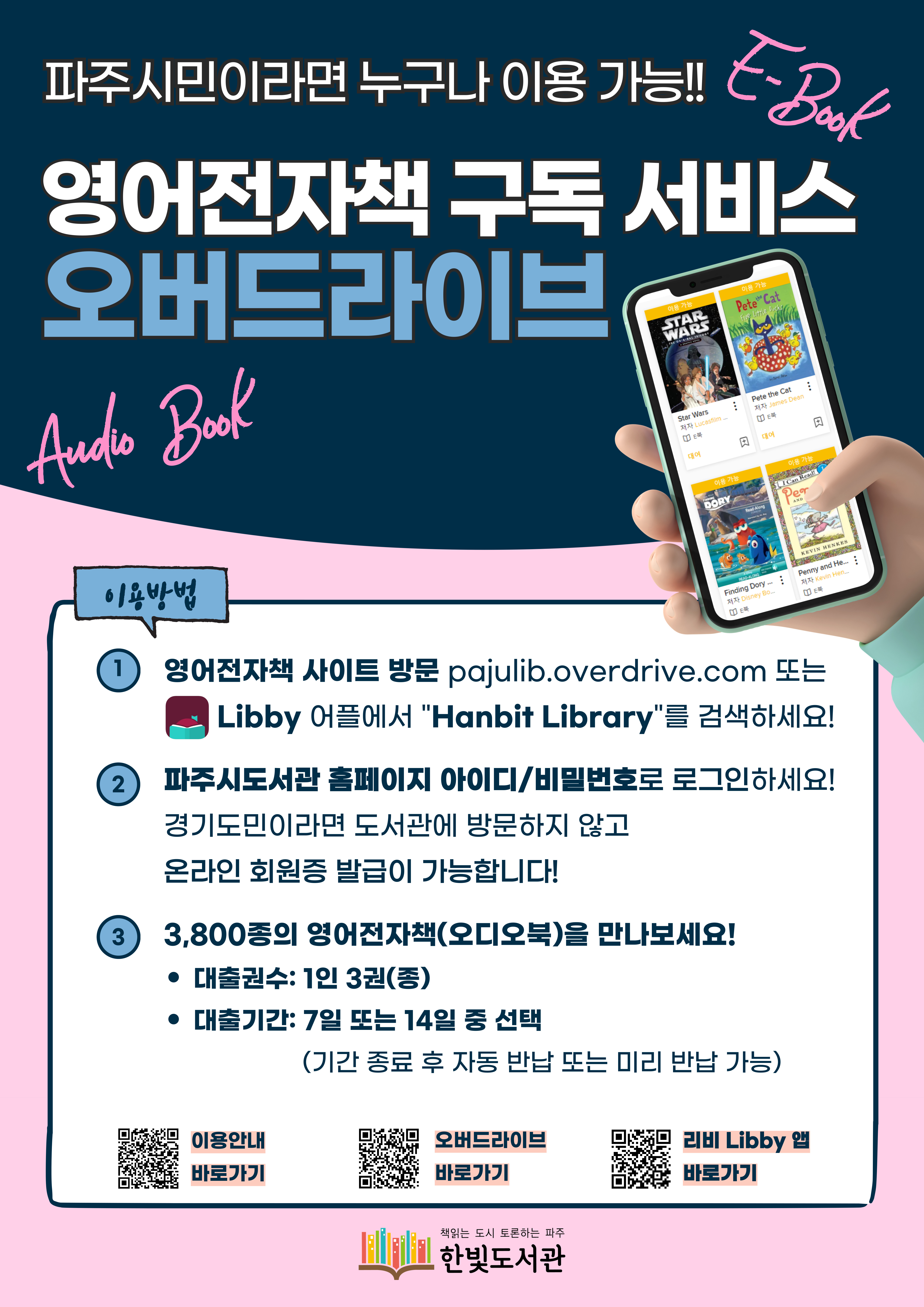 ❄️파주시민이라면 누구나 이용할 수 있는 영어전자책 구독 서비스 ‘오버드라이브’를 통해 영어 전자책과 오디오북을 언제 어디서나 만나볼 수 있습니다.