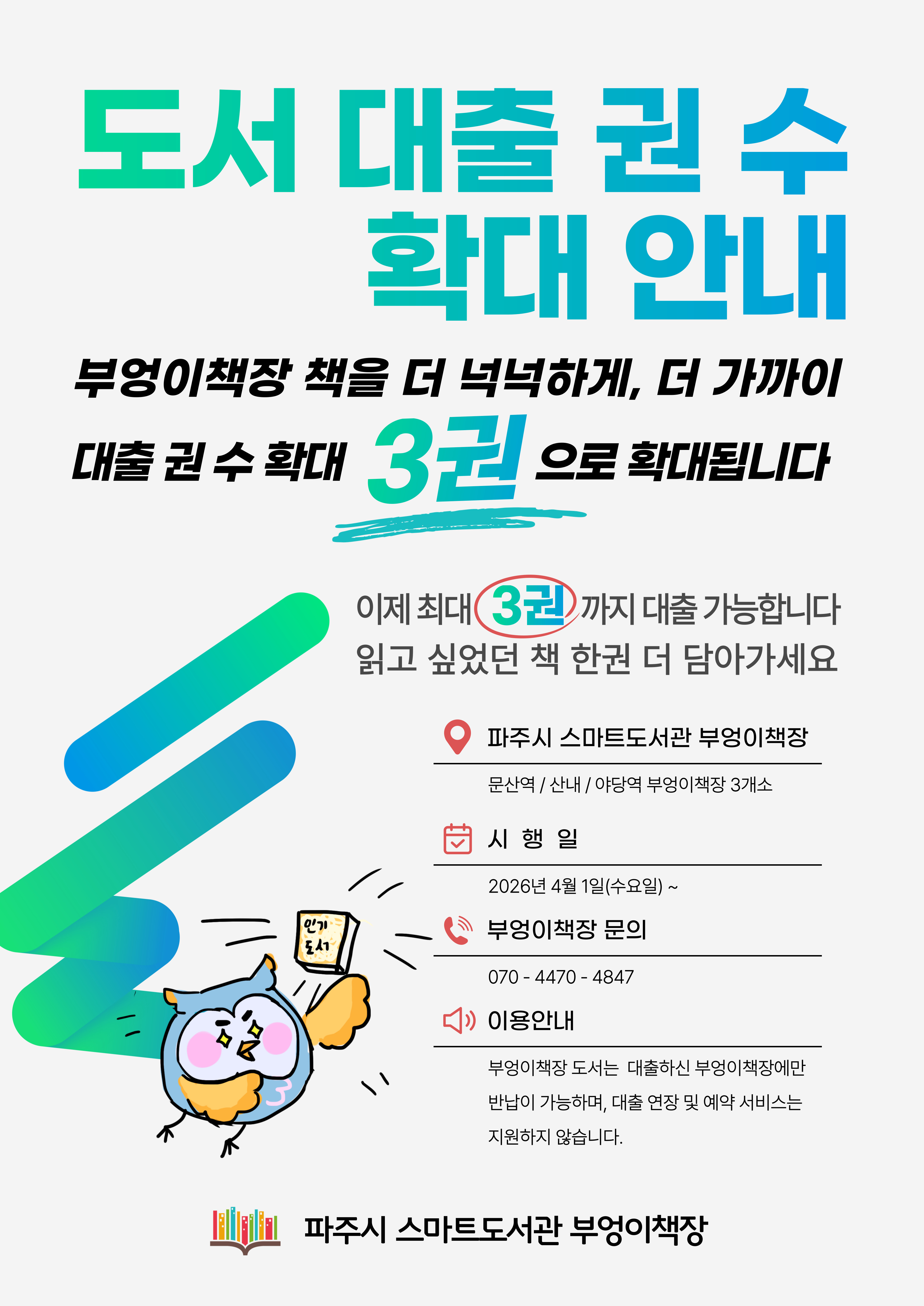 | 파주시 스마트도서관 부엉이책장 대출 권수 확대 시행 안내 | |
