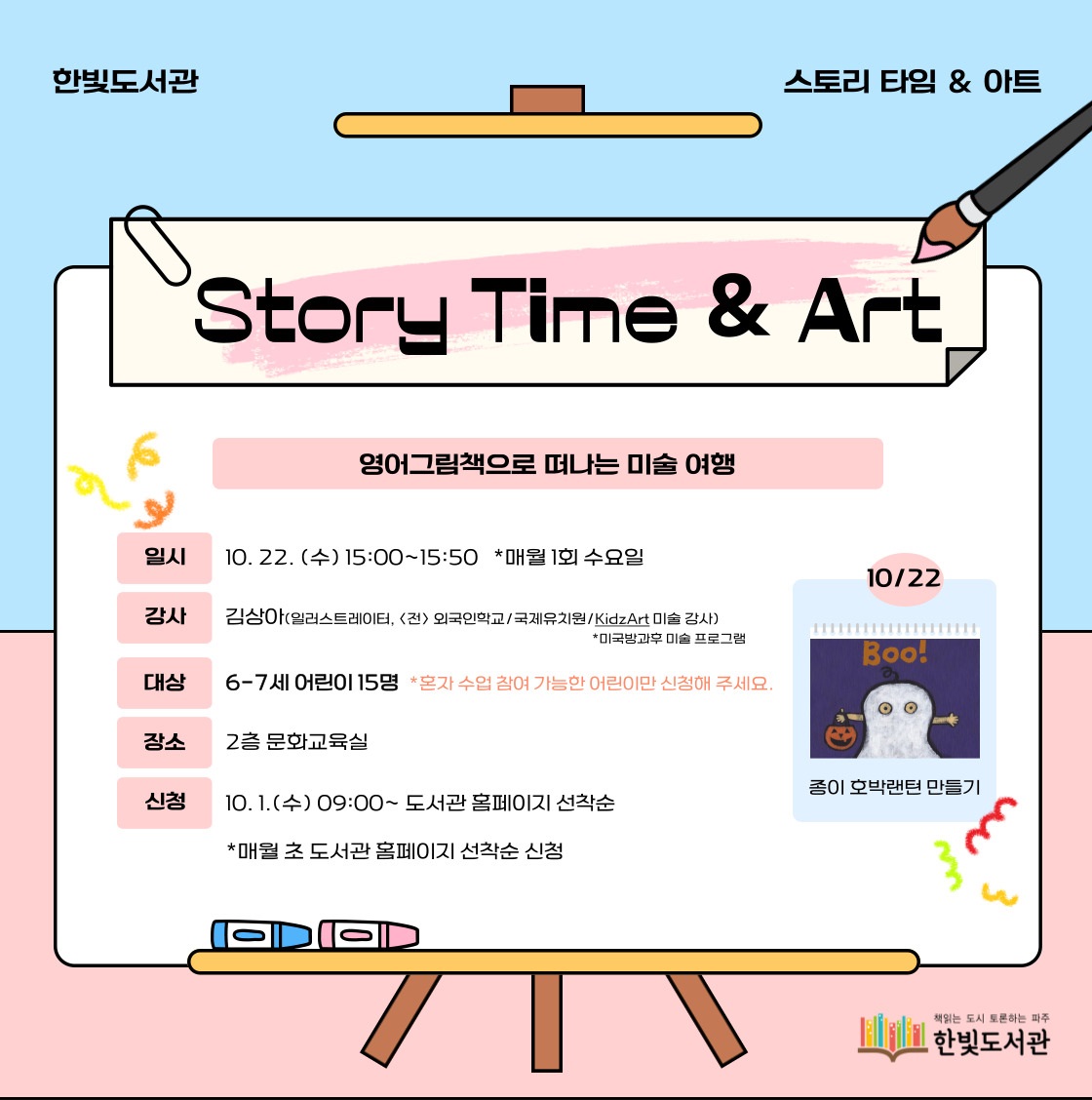 일 시 10. 22.(수) 15:00~15:50 대 상 6~7세 15명(2019-2020년생) *혼자 50분 수업 참여 가능한 어린이만 신청해 주세요. 장 소 2층 문화교육실 강 사 김상아[일러스트레이터, (전)외국인학교 등 미술 강사] 내 용 영어그림책 「Boo!」를 함께 읽고 ‘종이 호박 랜턴 만들기’ 미술 활동 신 청 10. 1.(수) 09:00 ~ 홈페이지 선착순 * 매월 세번 째 수요일, 새로운 영어그림책과 미술 활동을 만납니다// 매월 초 도서관 홈페이지에서 신청해 주세요! * 신청 시, 참여자 = 어린이 이름, 비고 = 나이를 기재해 주시기 바랍니다. * 참여 어린이 인원만큼 재료가 준비되는 수업입니다.