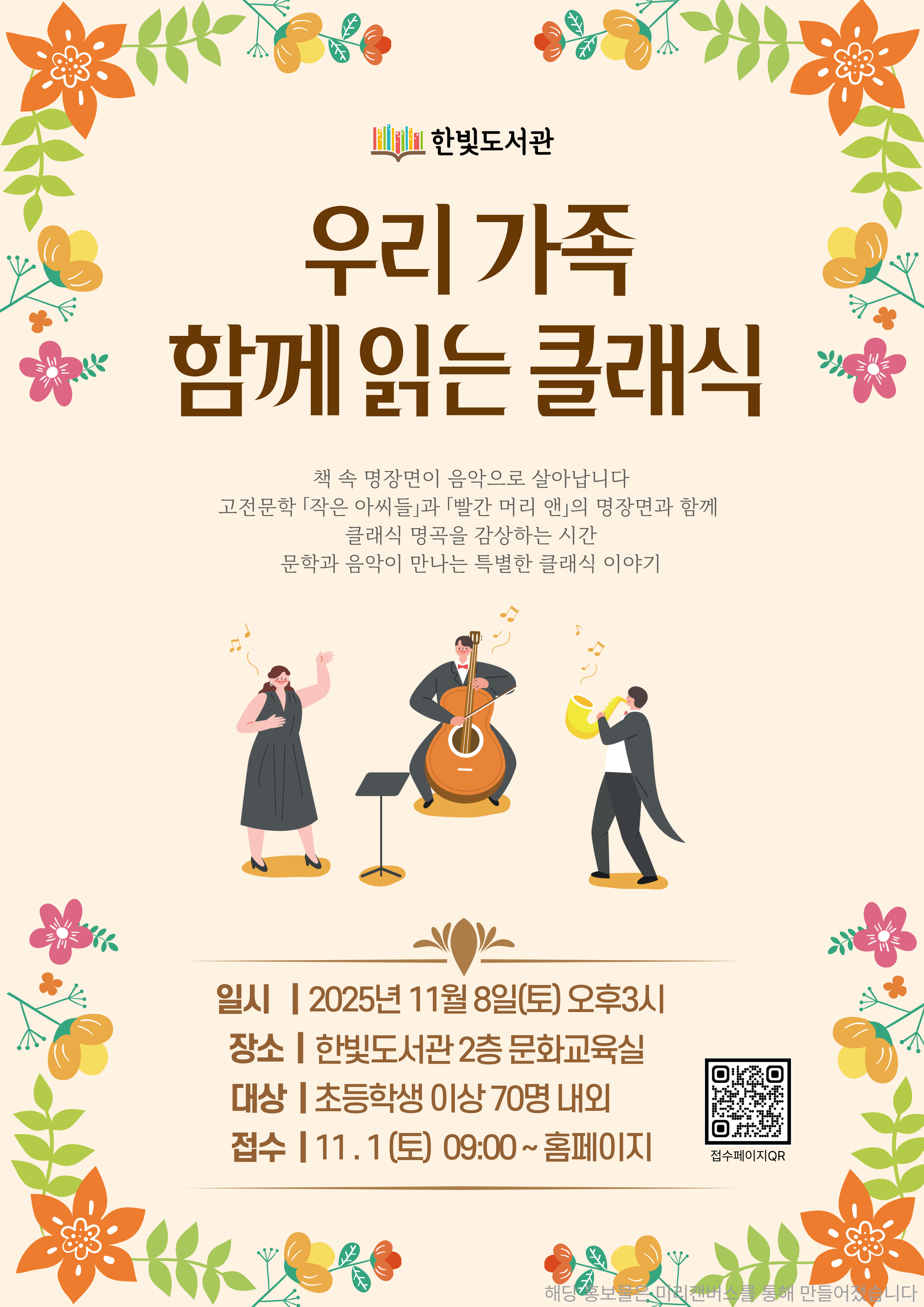 우리 가족 함께 읽는 클래식 고전문학 「작은 아씨들」과 「빨간 머리 앤」의 명장면과 함께 클래식 명곡을 감상하는 시간 "문학과 음악이 만나는 특별한 클래식 이야기" ○ 일 시: 2025. 11. 08. (토) 오후3시~3시50분 ○ 장 소: 한빛도서관 2층 문화강연실 ○ 대 상: 초등학생 이상 70명 내외 ○ 공 연: 인뮤직 ○ 문 의: 031-940-5725 ※ 신청기간(~11월 6일 23시)이후 취소 또는 무단불참 시 다음 인기강좌 신청 때 불이익이 있을 수 있습니다. 일정변동 시 다른 분들을 위해 꼭 사전에 취소 부탁드립니다. ※ 2025년 4월에 진행한 공연 <봄날의 그림책 멜로디> 무단 불참팀은 신청 시 취소됩니다. ※ 개별 또는 가족 단위로만 신청가능합니다. ※ 1인 최대 4인(가족)까지 신청가능합니다. 4인 이상 가족은 분리하여 신청해주시기 바랍니다. ※ 공연은 노쇼가 많아 부득이하게 제한사항이 많습니다. 많은 분들의 참여를 위해 양해부탁드립니다.