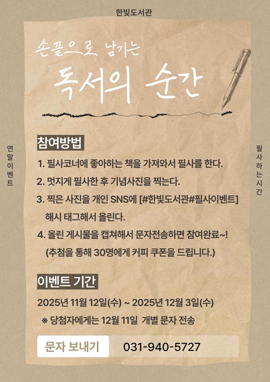 한빛도서관 연말 이벤트 '손끝으로 남기는 독서의 순간' 2층 종합자료실 창가에 필사코너가 마련되어 있습니다. 좋아하는 책 필사하면서 독서의 여운을 음미하고 이벤트에 참여해보세요! 추첨을 통해 소정의 선물을 드립니다. ![]()