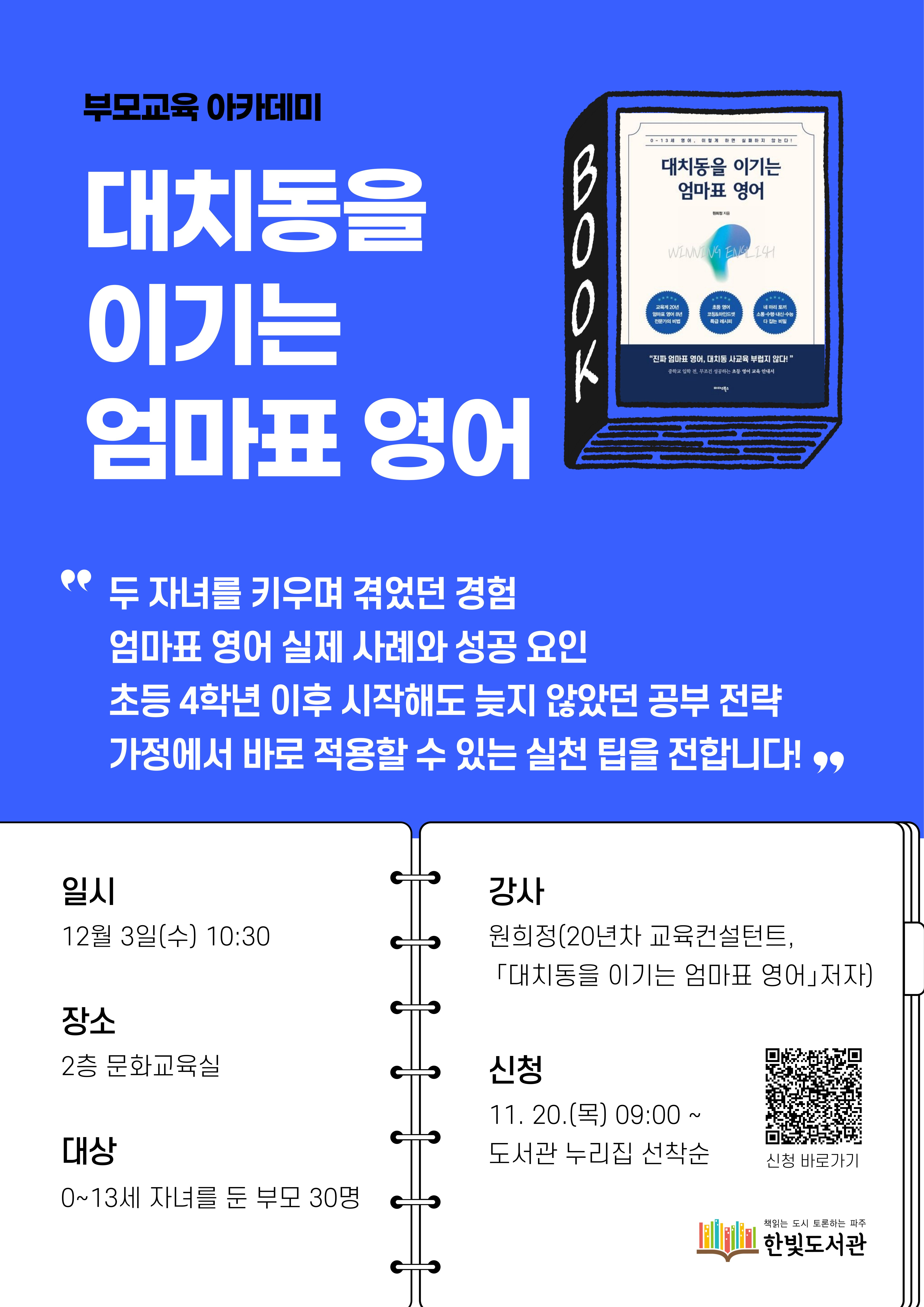 [부모교육 아카데미] 대치동을 이기는 엄마표 영어 두 자녀를 키우며 겪었던 경험과 엄마표 영어 실제 사례와 성공 요인, 초등 4학년 이후 시작해도 늦지 않았던 공부 전략, 가정에서 바로 적용할 수 있는 실천 팁 등을 전합니다. 일 시 12. 3.(수) 10:30~12:00 대 상 0~10세 자녀를 둔 부모 30명 강 사 원희정(20년 경력 교육컨설턴트, 「대치동을 이기는 엄마표 영어」 저자) 장 소 한빛도서관 2층 문화교육실 신 청 11. 20.(목) 09:00 ~ 도서관 누리집 선착순 ![]() |