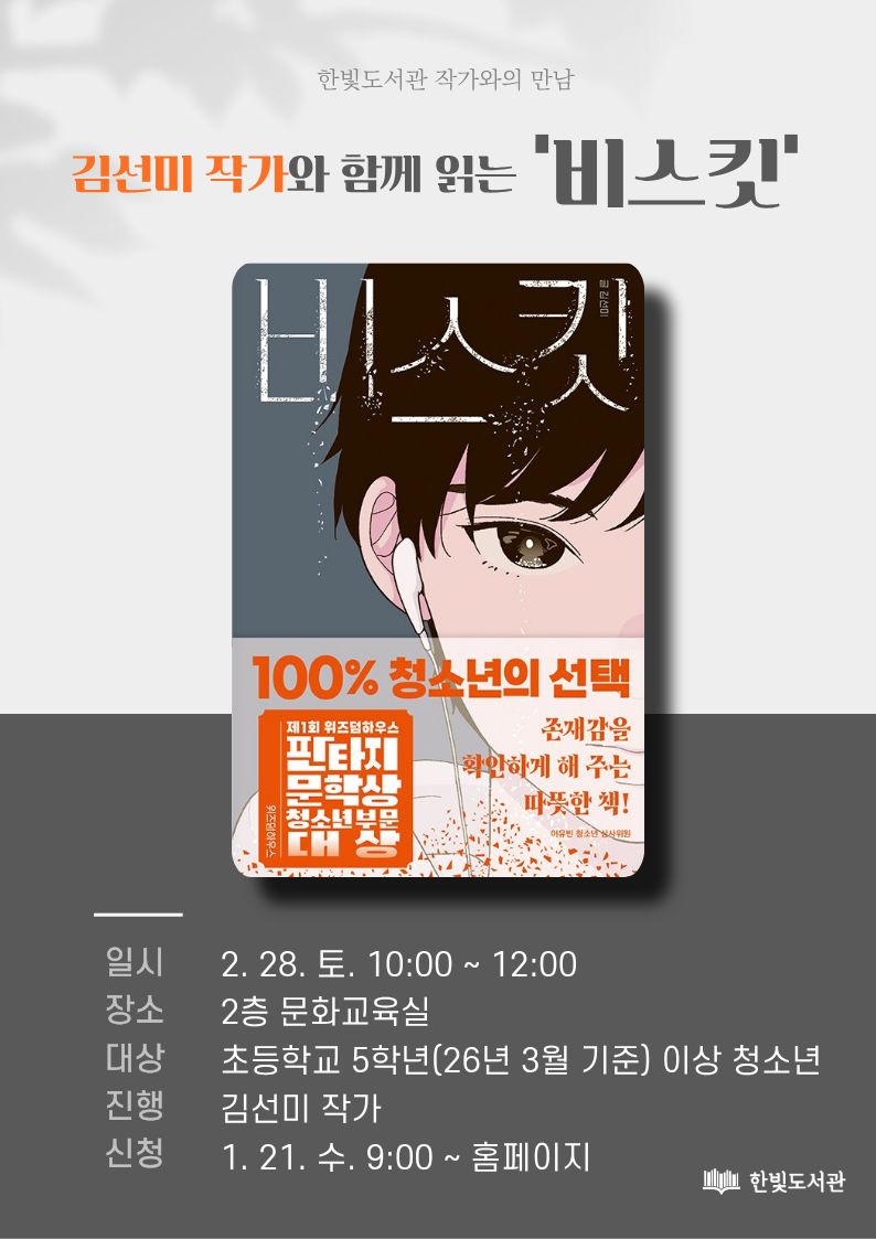 [한빛도서관 작가와의 만남] ★★신청 시 비고란에 참가학생 학년 꼭 써주세요!★★ 자신을 지키는 힘을 잃어버린 존재를 돕는 소년의 모험 이야기, 김선미 작가님과 함께 비스킷을 읽고 나를 지키고 내주변의 존재들에 대해서 이야기 하는 시간을 가져보세요! 일시 2026.2.28.토 10:00~12:00 장소 2층문화교육실 대상 초등학교 5학년(26년3월 기준) 이상 청소년 진행 김선미 작가 신청 2026.1.21.수 9:00~ 홈페이지 추천대상 새학기를 앞두고 새로운 친구들을 만나는 것이 걱정되는 사람 비스킷을 재밌게 읽어서 작가님을 만나고 싶은 사람 ※ 행사 전 반드시 책을 읽고 참가해주세요. *개인소장 도서를 가져오시면 작가님의 사인을 받을 수 있습니다. (종이에 사인불가)*