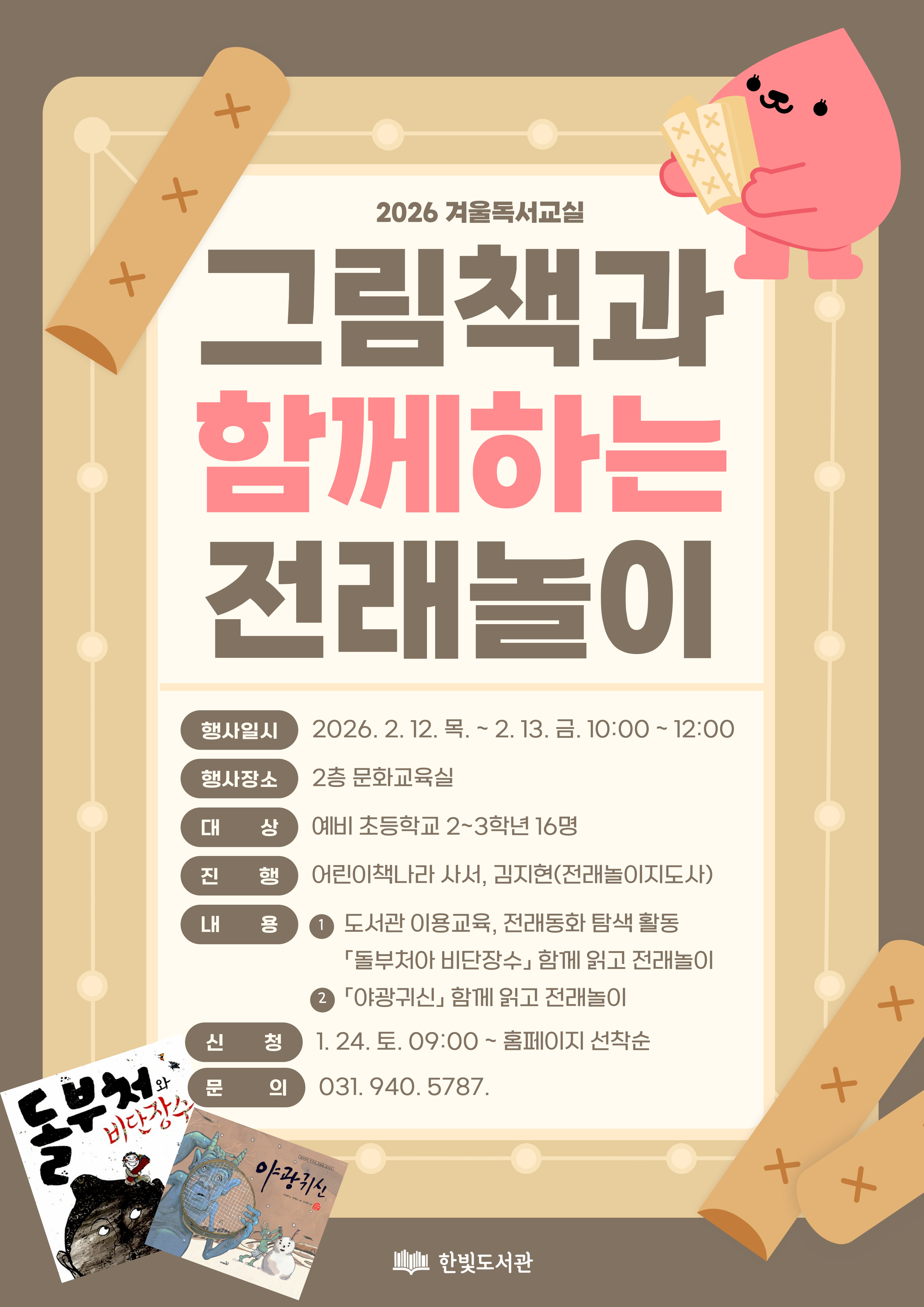 한빛도서관 2026 겨울 독서교실 그림책과 함께하는 전래놀이 옛날이야기 좋아하는 친구들 모여라! 전래동화도 읽고, 재미있는 전래놀이도 함께해요! 책 속 이야기가 놀이가 되는 시간 전래동화 그림책과 함께하는 전래놀이, 겨울독서교실에 여러분을 초대합니다. ★ 일시 : 2. 12. 목. ~ 2. 13. 금. 10:00 ~ 12:00 ★ 장소 : 2층 문화교육실 ★ 대상 : 예비 초등학생 2~3학년 16명 ★ 진행 : 어린이책나라 사서, 김지현 강사(전래놀이지도사) ★ 신청 : 1. 24. 토. 9:00 ~ 홈페이지 선착순 접수 ★ 문의 : 031-940-5737(5787) ※ 참가자란에 2026년도 기준 학년을 기입해주시기 바랍니다 (예시: 3학년 김한빛) ![]() |