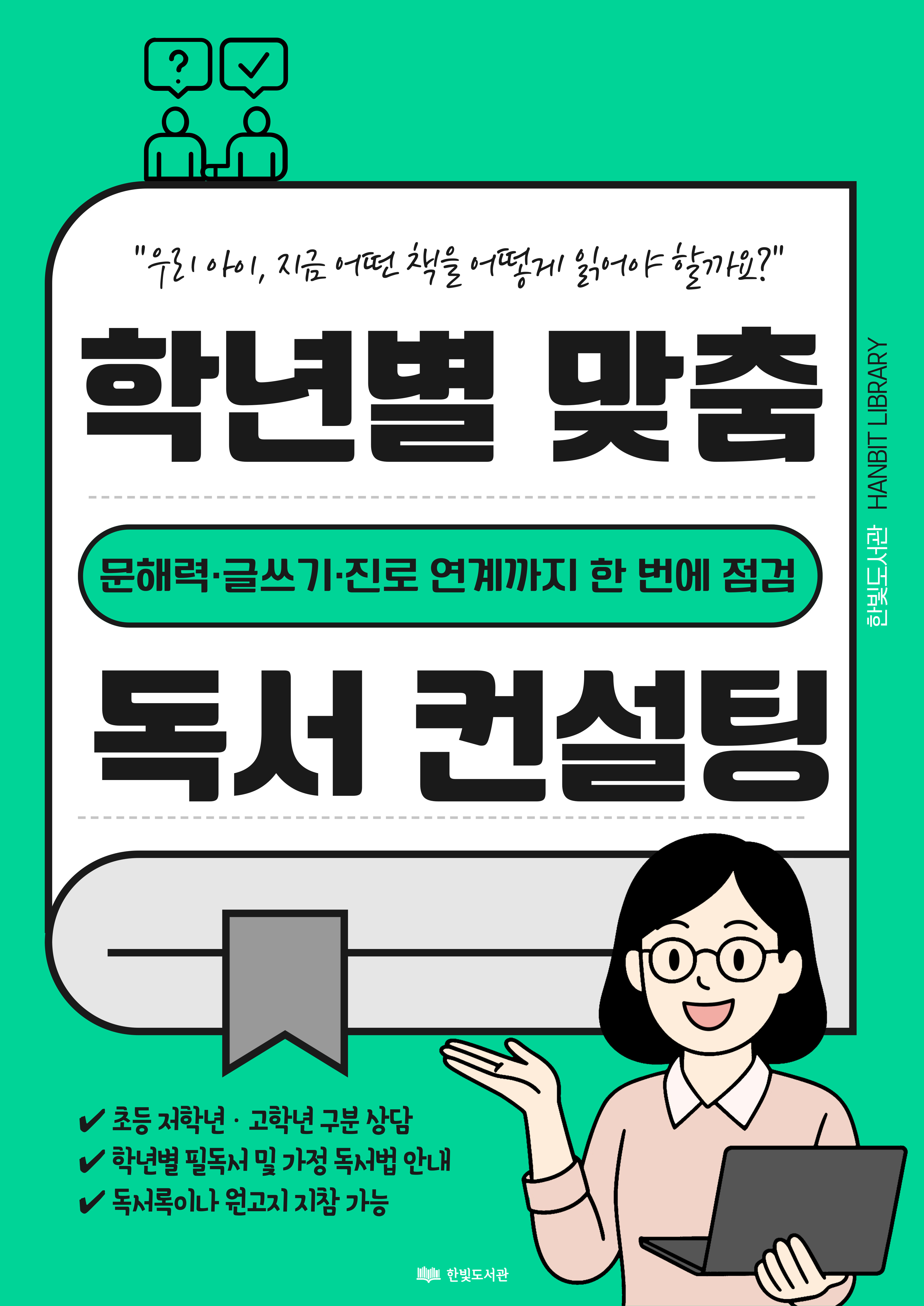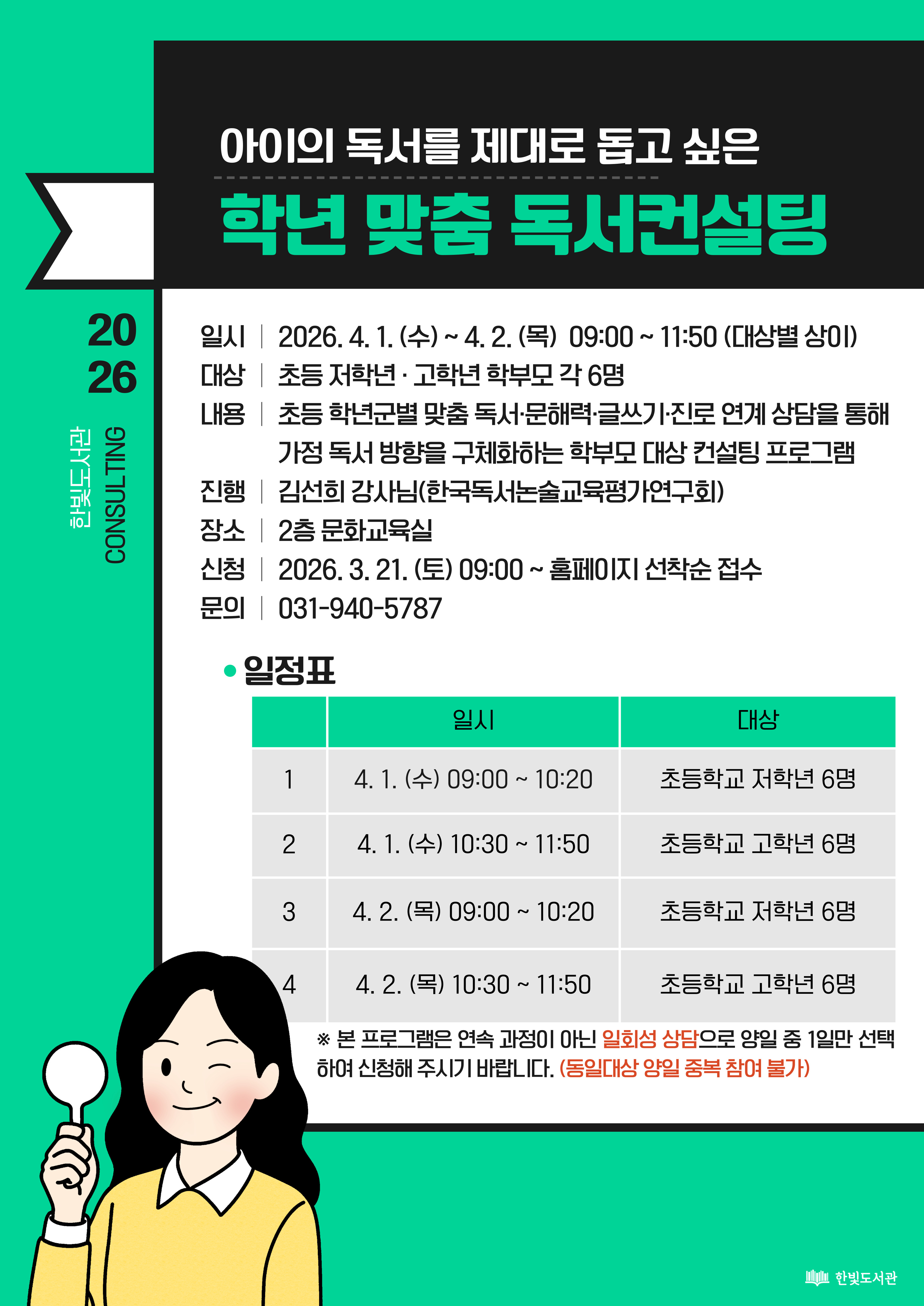 ※ 이 페이지는 4. 2. (목) 고학년 학부모 신청 페이지입니다. ※ 이 페이지는 4. 2. (목) 고학년 학부모 신청 페이지입니다. ※ 이 페이지는 4. 2. (목) 고학년 학부모 신청 페이지입니다. [한빛] 학부모상담 「학년별 맞춤 독서컨설팅」 "우리 아이, 지금 어떤 책을 어떻게 읽어야 할까요?" 학년별 발달 단계에 맞춘 그룹 독서 컨설팅 문해력부터 글쓰기, 진로 연계까지 한 번에 점검해 드립니다. ✔ 초등 1~3학년 / 4~6학년 구분 상담 ✔ 학년별 필독서 및 가정 독서법 안내 ✔ 독서록이나 원고지 지참 가능 일시 │ 2026. 4. 2. (목) 10:30 ~ 11:50 대상 │ 초등 고학년 학부모 6명 내용 │ 초등 학년군별 맞춤 독서·문해력·글쓰기·진로 연계 상담을 통해 가정 독서 방향을 구체화하는 학부모 대상 컨설팅 프로그램 진행 │ 김선희 강사님(한국독서논술교육평가연구회) 장소 │ 2층 문화교육실 신청 │ 2026. 3. 21. (토) 09:00 ~ 홈페이지 선착순 접수 문의 │ 031-940-5787 ※ 본 프로그램은 연속 과정이 아닌 일회성 상담으로 양일 중 1일만 선택하여 신청해 주시기 바랍니다. (동일 대상 중복 신청 불가) ![]()