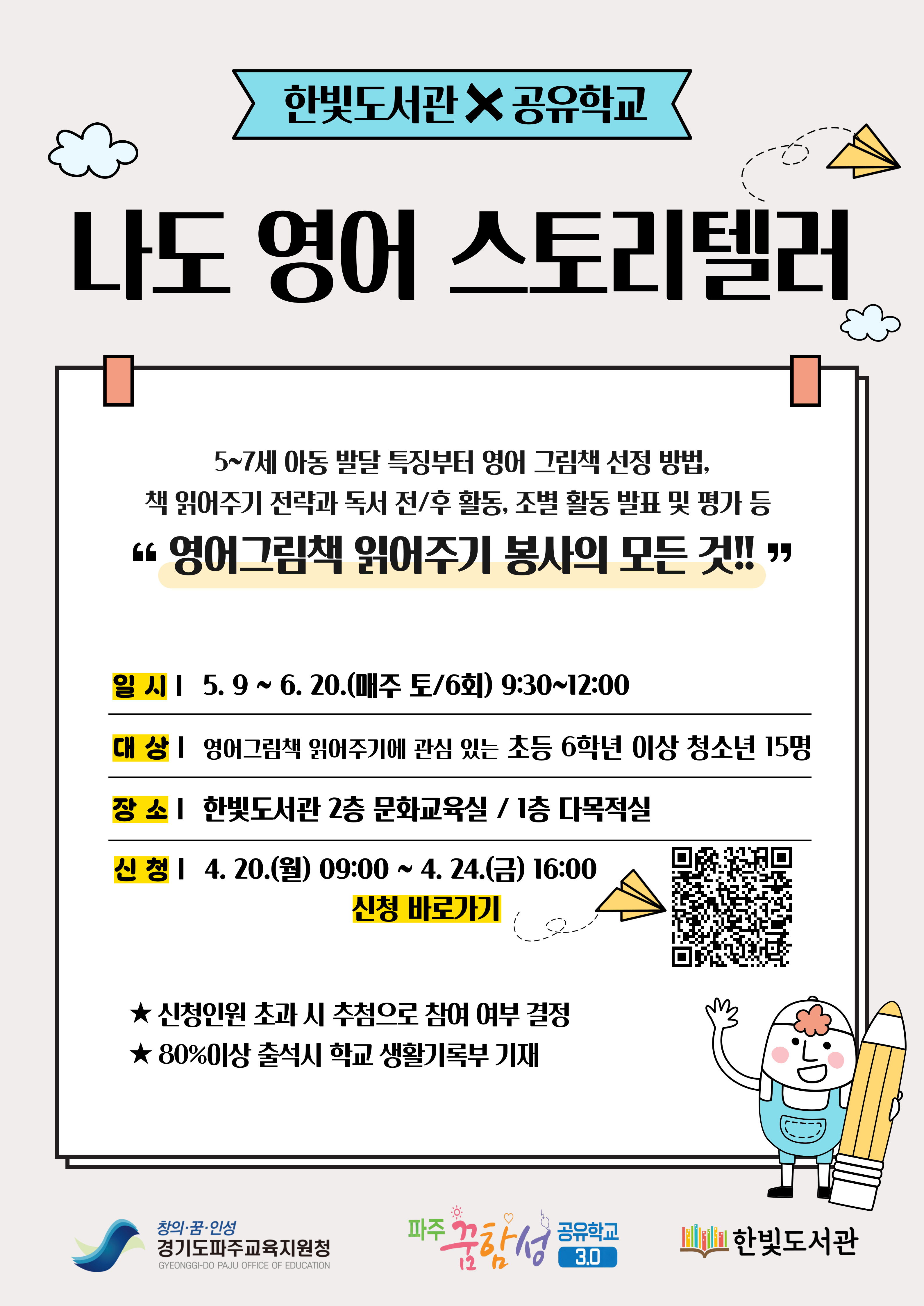[한빛도서관x청소년] 나도 영어 스토리텔러 2026년 공유학교 신청은 파주 교육지원청의 꿈함성 공유학교 사이트를 통해 진행되며, 일 시 5. 9. ~ 6. 20.(매주 토/6회) 9:30~12:00 대 상 영어그림책 읽어주기에 관심 있는 초등 6학년 이상 청소년 15명 장 소 2층 문화교육실 / 1층 다목적실 내 용 5~7세 아동 발달 특징부터 영어 그림책 선정 방법, 책 읽어주기 전략과 독서 전/후 활동, 조별 활동 발표 및 평가 등 영어그림책 읽어주기 봉사의 모든 것!! 신 청 4. 20.(월) 09:00 ~ 4. 24.(금) 16:00 까지 파주 교육지원청의 공유학교 사이트 신청 신청페이지 바로가기(클릭) ○ 프로그램별 참여 확정 학생 : 개별 문자 전송 및 안내 예정 ![]() 신청 바로가기(파주 꿈함성 공유학교 신청페이지로 연결) 4월20일(월)부터 신청 가능합니다! |