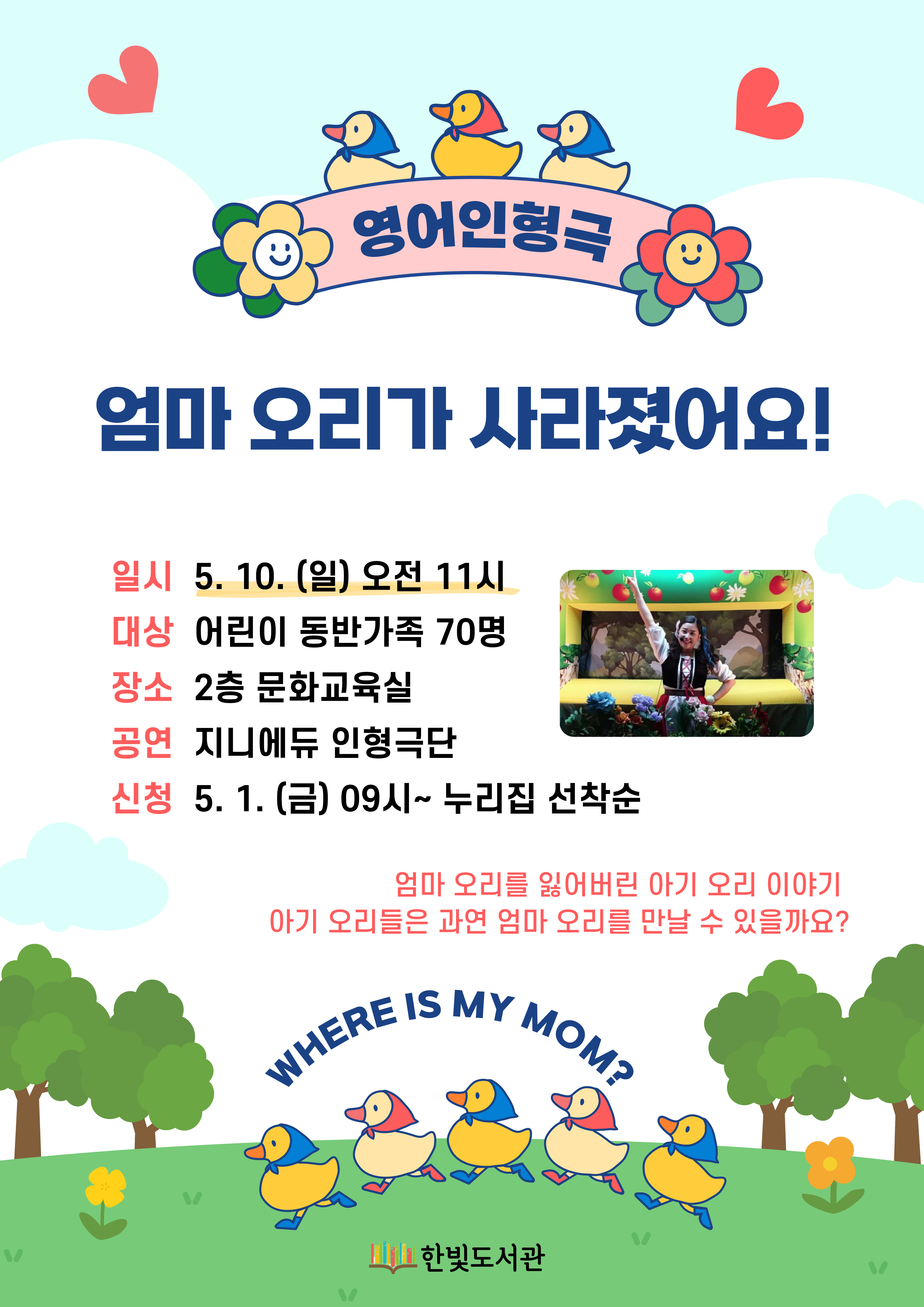[영어 인형극] 엄마 오리가 사라졌어요! Where is my mom? 일시 5. 10. (일) 오전 11시 대상 유아 및 어린이 50명 **초등 저학년까지 권장** 장소 2층 문화교육실 공연 지니에듀 인형극단 신청 5. 1. (금) 09시~ 홈페이지 선착순 내용 말썽쟁이 아기 오리를 찾으러 숲속으로 들어간 엄마 오리와 엄마를 잃어버린 아기 오리들의 이야기! 가정의 달을 맞아, 가족의 사랑과 소중함을 전하는 영어인형극을 만나보세요! ✔️ 참여하는 어린이 기준으로 신청해주세요. (어린이 2명일 경우 2개의 아이디로 각각) ✔️ 신청 시 참여자명에 어린이 이름과 나이, 비고에 보호자 동반 여부를 적어주세요! ✔️ 공연 장소가 협소하여, 혼자 관람 가능한 어린이(유아)는 어린이만 우선 입장하고, 보호자 동반이 꼭 필요한 어린이는 보호자 중 1명 함께 입장 가능합니다.