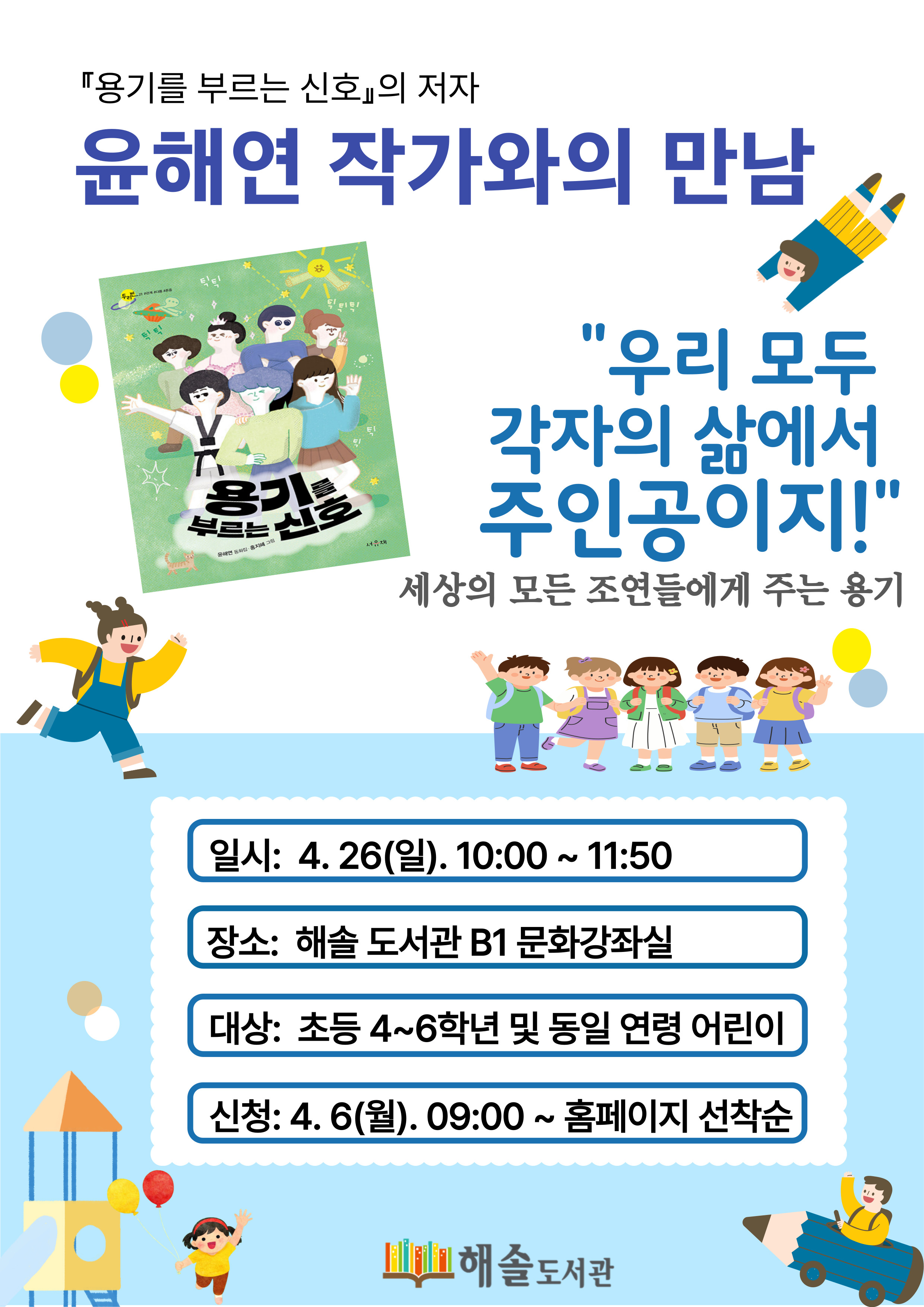 해솔 어린이 자료실 3~4월 전시도서 연계 프로그램 윤해연 작가와의 만남 "우리 모두 각자의 삶에서 주인공이지!" - 세상의 모든 조연들에게 주는 용기 주인공만이 빛나는 세상이라고 느껴진다구요? 주인공이 될 자신이 없어 그저 그들이 부러운 생각만 든다구요?
