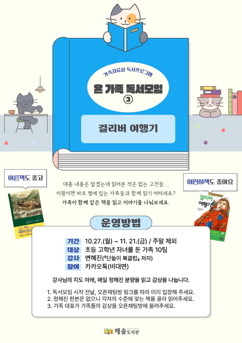 [해솔도서관 온 가족 독서모임 ③] <걸리버여행기> 조너선 스위프트 ~가족이 함께 같은 책을 읽고 이야기를 나눠보세요~ 소인국 대인국의 반 쪽짜리일 뿐, 걸리버의 진짜 이야기는 따로 있다! ○ 일시 : 10/27(월) ~ 11/21(금) / 주말 제외 ○ 대상 : 초등 고학년 자녀를 둔 가족 10팀 ○ 신청 : 10/13(월) ~ 선착순 마감 시까지 ○ 운영방법 : 카카오톡(비대면) / 강사님의 지도 아래, 매일 정해진 분량을 읽고 감상을 나눕니다. 1. 독서모임 시작 전날, 담당자가 문자로 오픈채팅방 링크를 발송하면 미리 입장해주세요. 2. 정해진 판본은 없으니 각자의 수준에 맞는 책을 골라 읽어주세요. 3. 가족대표가 가족들의 감상을 오픈채팅방에 올려주세요. ※ 기간이 길지만 참여할 수 있는 인원이 한정되어 있습니다. 꾸준히 참석가능한 분들만 신청해주세요! ○ 문의 : 해솔도서관 가족자료실(031-940-5143) ![]() |