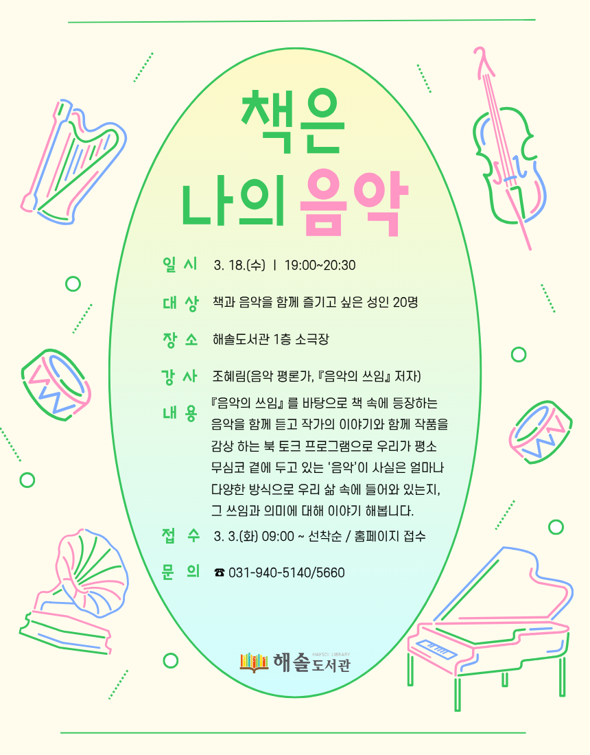 [해솔도서관 컬렉션 연계강좌] 책은 나의 음악 당신에게 음악은 어떤 의미인가요? 우리 각자의 삶에서 음악이 어떤 식으로 곁에 있었는지에 대해 이야기 해봅니다. ○ 대상 : 책과 음악을 함께 즐기고 싶은 성인 20명 ○ 장소 : 해솔도서관 1층 소극장 ○ 강사 : 조혜림(음악평론가, 『음악의 쓰임』 저자) ○ 내용 : 『음악의 쓰임』 를 바탕으로 책 속에 등장하는 음악을 함께 듣고 작가의 이야기와 함께 작품을 감상 하는 북 토크 프로그램으로 우리가 평소 무심코 곁에 두고 있는 ‘음악’이 사실은 얼마나 다양한 방식으로 우리 삶 속에 들어와 있는지, 그 쓰임과 의미에 대해 이야기 해봅니다. ○ 접수 : 3.3.(화) ~ 선착순 마감 시까지 ○ 문의 : ☎ 031-940-5140/5660 ![]() |