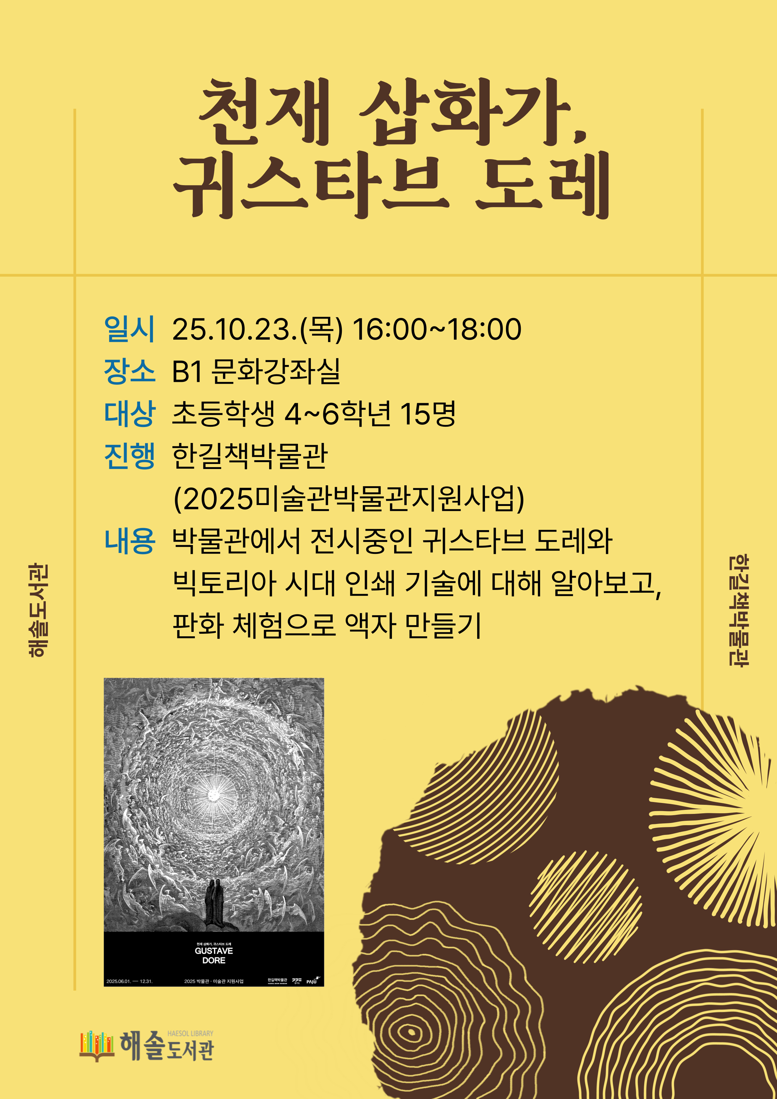 [해솔도서관X한길책박물관] 천재 삽화가, 귀스타브 도레 일시 10.23.(목) 16:00~18:00 장소 B1 문화강좌실 대상 초등학생 4~6학년 15명 진행 한길책박물관 내용 박물관에서 전시 중인 귀스타브 도레와 빅토리아 시대 인쇄 기술에 대해 알아보고, 판화체험으로 액자 만들기 * 조각칼 사용이 있어 저학년은 참여가 어렵습니다. 중학생 참여희망자는 신청 가능합니다. ![]() |